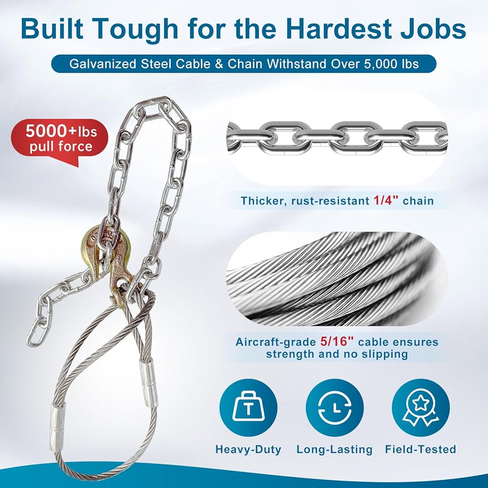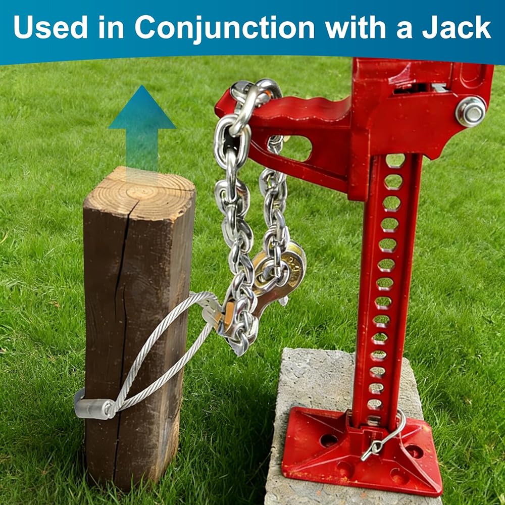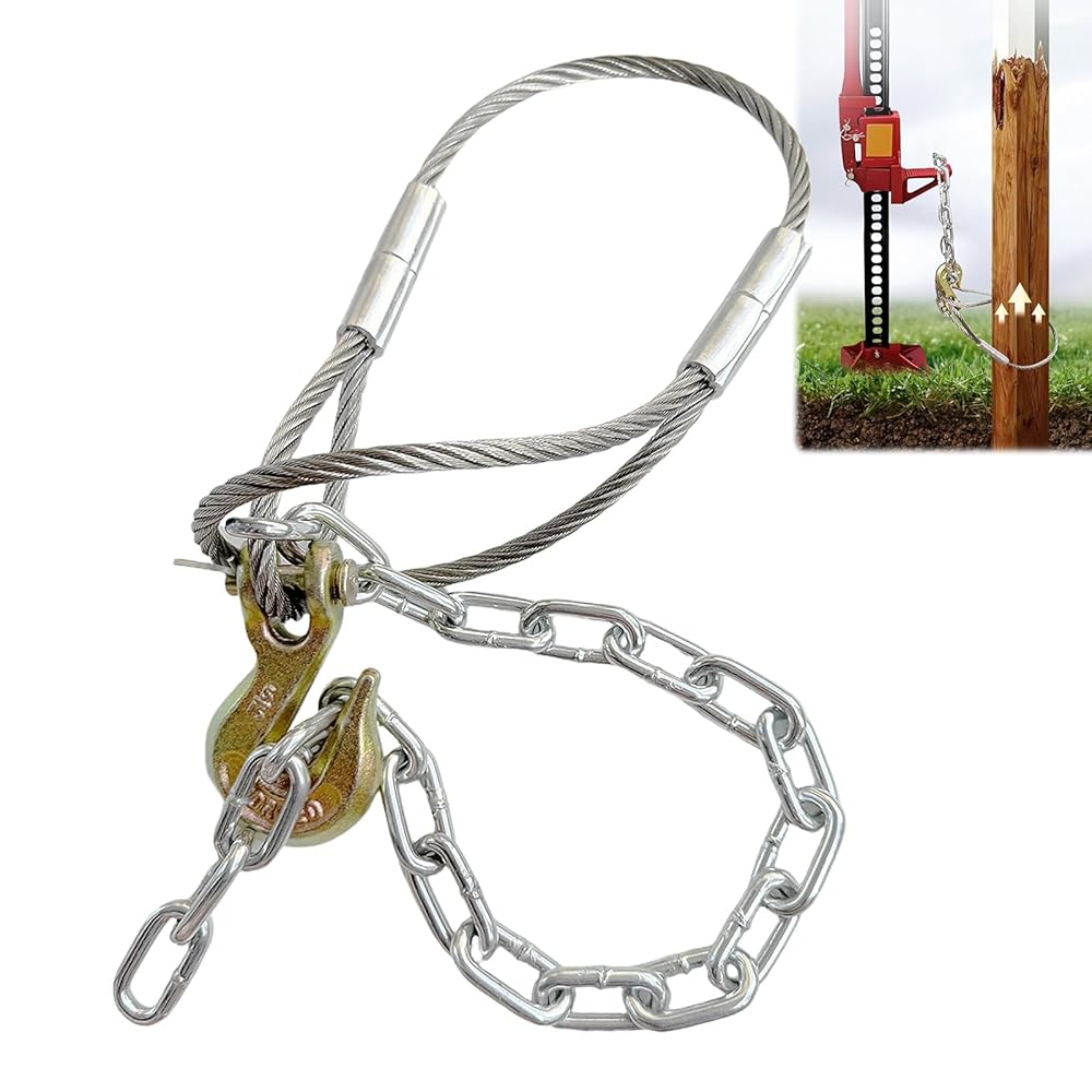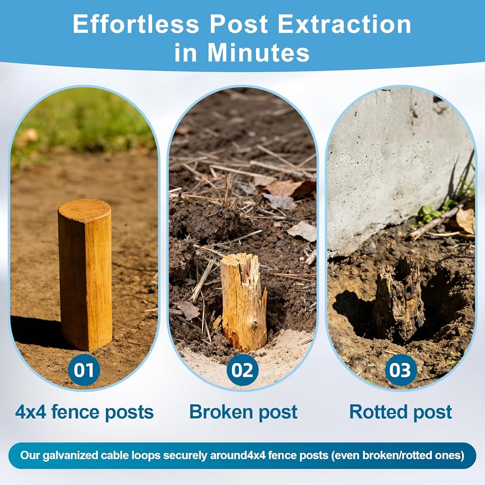 • Effortless Post Extraction in Minutes: Say goodbye to back-breaking work! Our 8mm (5/16") galvanized steel cable loops securely around 4x4 fence posts (even broken or rotted ones), while the ¼" chain easily connects to any jack or lever. Simply tighten and lift – no digging or hammering needed. Ideal for concrete-set posts and DIYers of all skill levels.