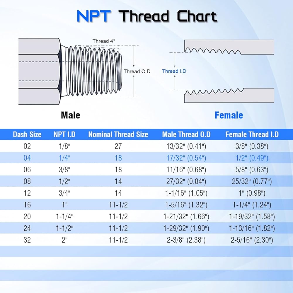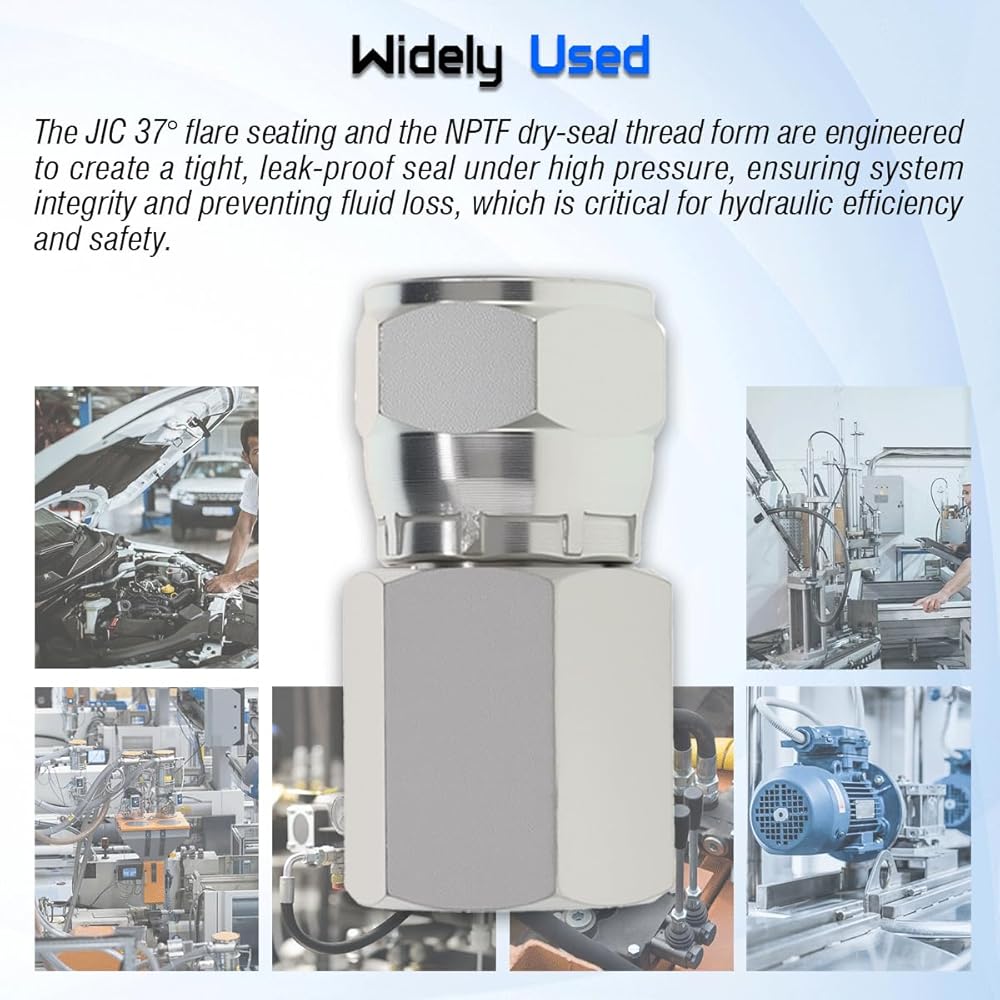 【Industry Standard】Manufactured to meet SAE J514 industry standards. The JIC 37° flare seating and the NPTF dry-seal thread form are engineered to create a tight, leak-proof seal under high pressure, ensuring system integrity and preventing fluid loss, which is critical for hydraulic efficiency and safety.