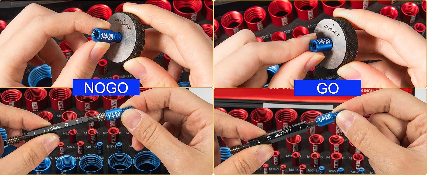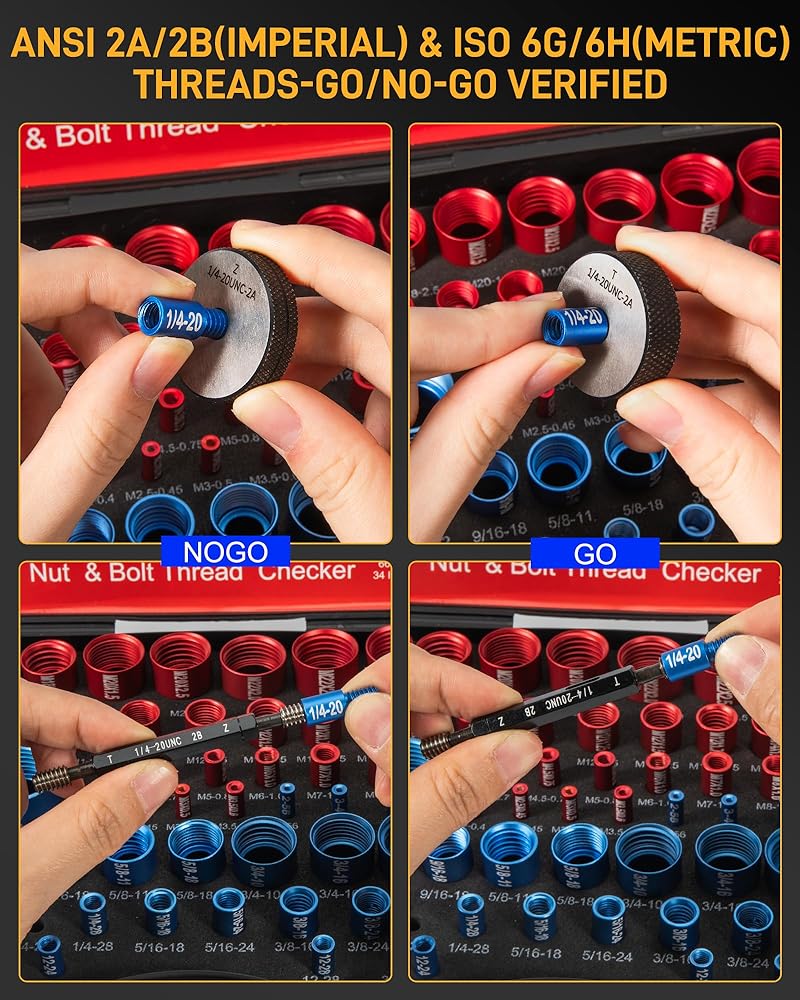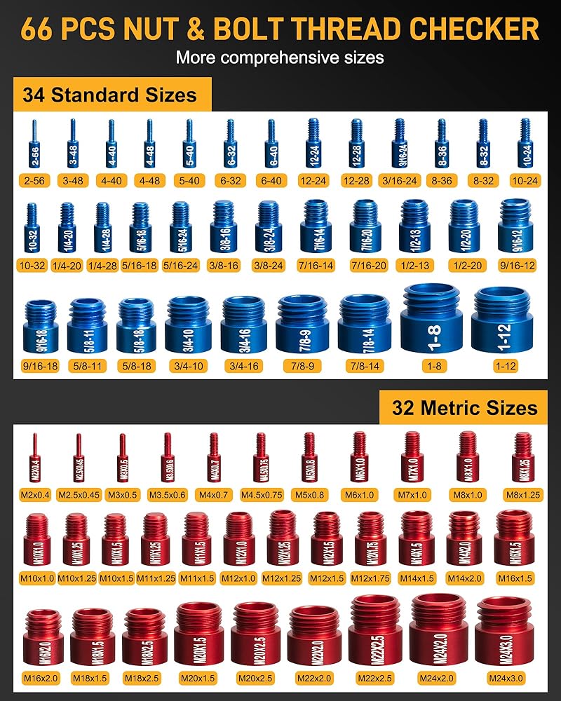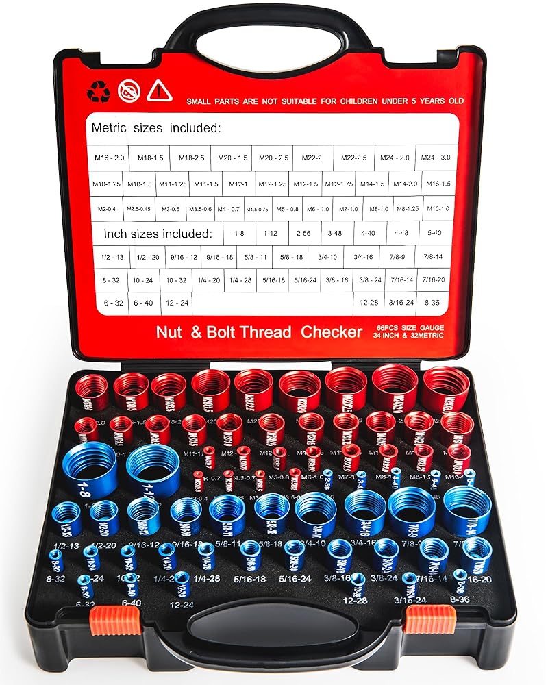 نطاق الحجم المتري الكامل (32 مقياسًا أحمر): لا تدع الأجهزة المترية تؤخر عملك - تتضمن مجموعة فحص الخيوط لدينا 32 حجمًا متريًا أساسيًا: M2x0.4، M2.5x0.45، M3x0.5، M3.5x0.6، M4x0.7، M4.5x0.75، M5x0.8، M6x1.0، M7x1.0، M8x1.0، M8x1.25، M10x1.0، M10x1.25، M10x1.5، M11x1.25، M11x1.5، M12x1.0، M12x1.25، M12x1.5، M12x1.75، M14x1.5، M14x2.0، M16x1.5، M16x2.0، M18x1.5، M18x2.5، M20x1.5، M20x2.5، M22x2.0، M22x2.5، M24x2.0، M24x3.0. فهو يتعامل مع كل مهمة خيوط مترية، من الأجهزة الإلكترونية الصغيرة إلى الآلات الثقيلة