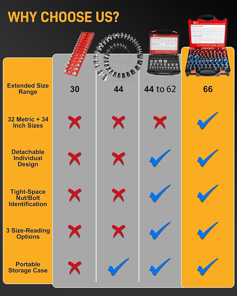 مجموعة أدوات فحص الخيوط الموسعة المكونة من 66 قطعة: المزيد من الأحجام لتغطية كل الاحتياجات، قم بترقية صندوق الأدوات الخاص بك باستخدام 66 أداة فحص خيط قابلة للفصل - 34 SAE (أزرق إمبراطوري مرمز بالألوان) و32 مقاسًا متريًا (أحمر ملون) - مثالية لمطابقة الصواميل والمسامير والأجهزة بجميع أنواعها. كل مقياس خيط متداخل بشكل فردي في حشوة إسفنجية مخصصة، لذلك يمكنك سحب الحجم الدقيق الذي تحتاجه على الفور دون الحاجة إلى البحث. على عكس البدائل الضخمة من نوع السلسلة أو المثبتة على اللوحة، يعمل تصميمنا المرن وخفيف الوزن بسلاسة في المساحات الضيقة التي يصعب الوصول إليها - وهو مثالي للإصلاحات أثناء التنقل أو مشاريع ورشة العمل أو عمليات فحص موقع العمل