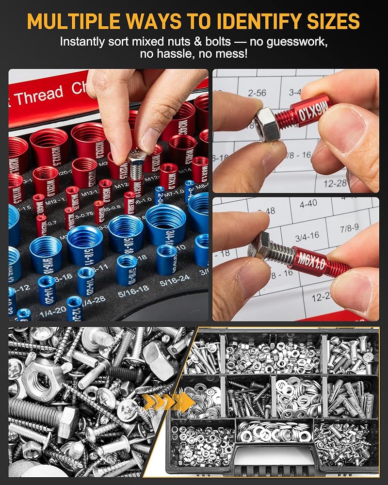 3 طرق لتحديد الحجم بدون جهد: تسريع عمليات فحص الخيوط من خلال 3 خيارات قراءة بديهية: علامات مقاومة للخدش محفورة بالليزر على كل مقياس، ومخطط مقاسات مرجعي سريع، وفتحات إدخال إسفنجية ذات علامات واضحة. مرمزة بالألوان للفرز الفوري (الأزرق = SAE، الأحمر = متري) - مما يجعل فحص الخيط خاليًا من المتاعب للمحترفين ومحترفي الأعمال اليدوية على حد سواء