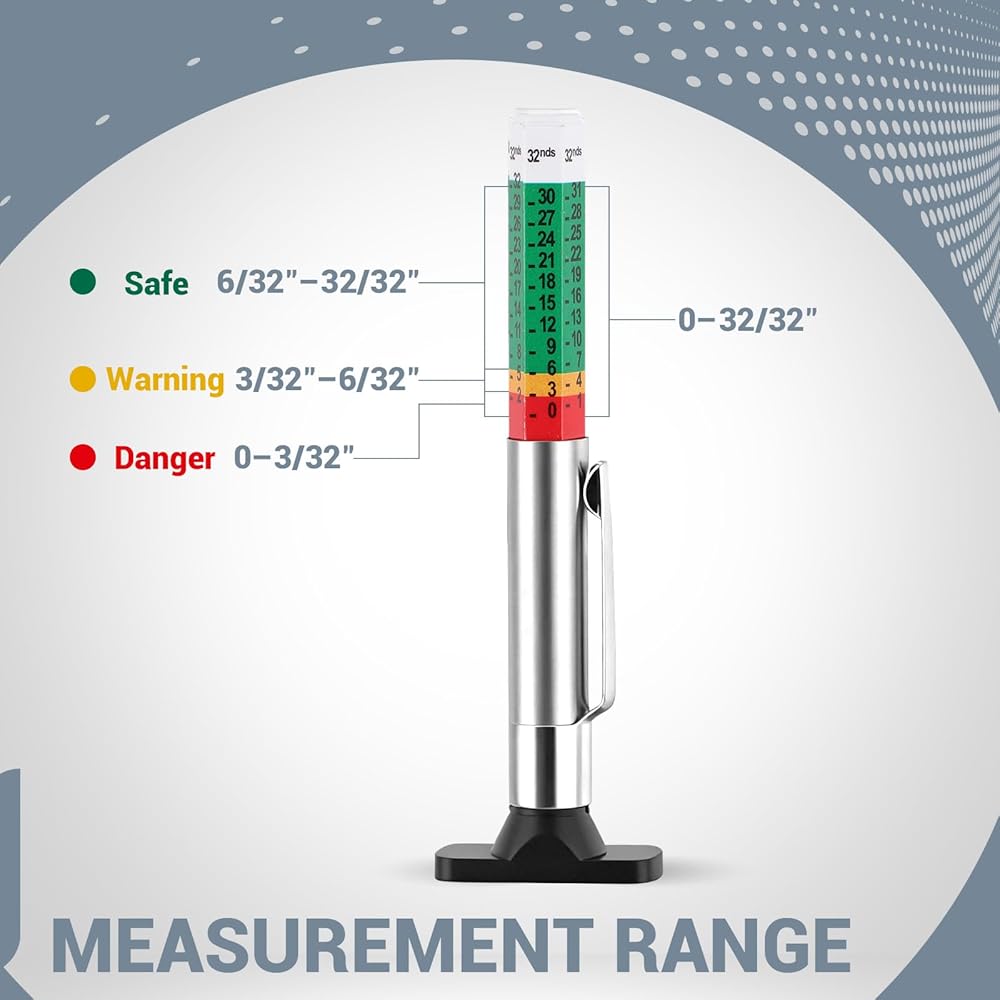 مناطق مرمزة بالألوان سهلة القراءة: اللون الأخضر (6/32 بوصة إلى 32/32 بوصة) يشير إلى عمق مداس آمن، الأصفر (3/32 بوصة إلى 6/32 بوصة) يشير إلى الحذر والمراقبة الدقيقة اللازمة، الأحمر (0/32 بوصة إلى 3/32 بوصة) يحذر من الخطر ويوصى بالاستبدال