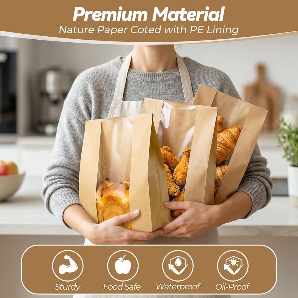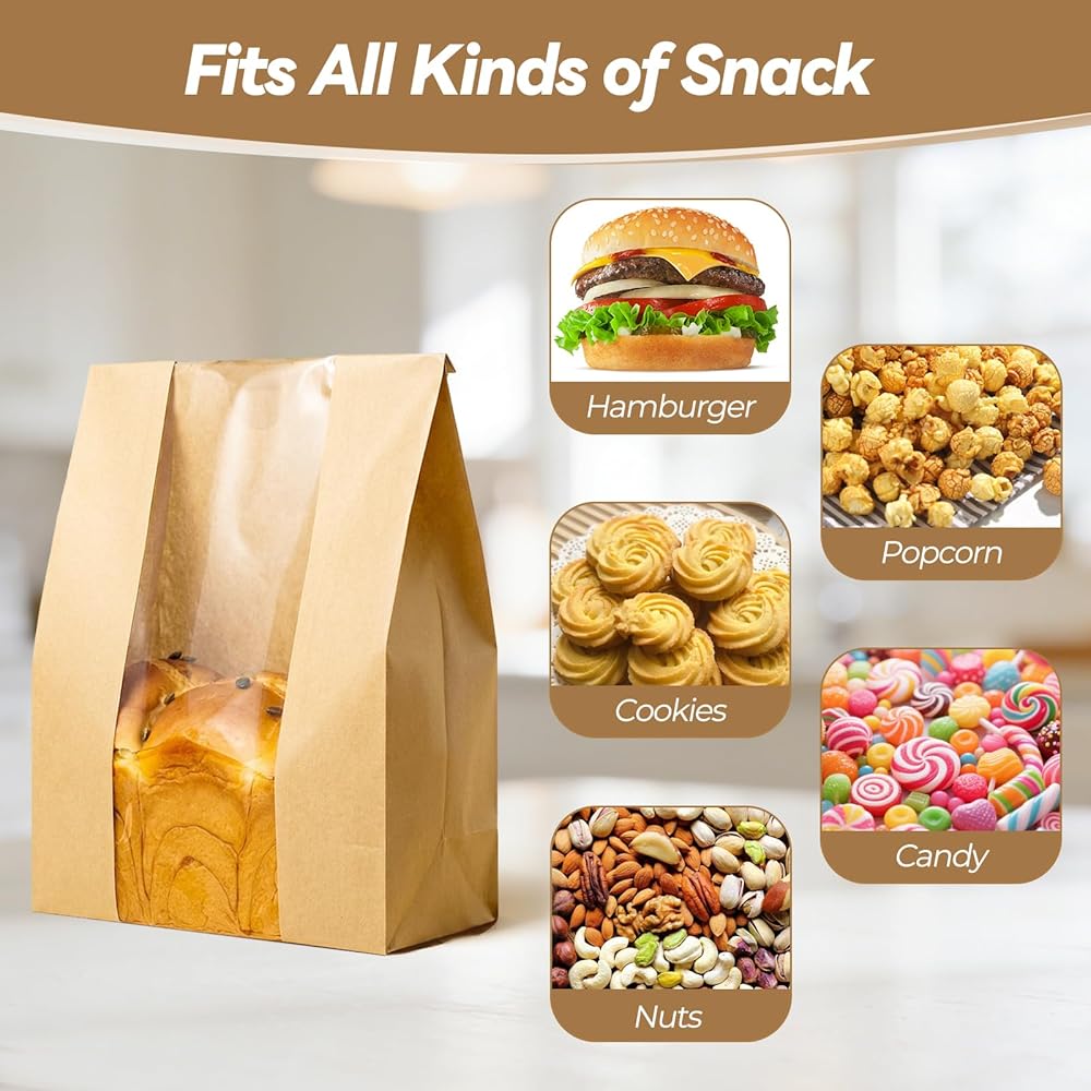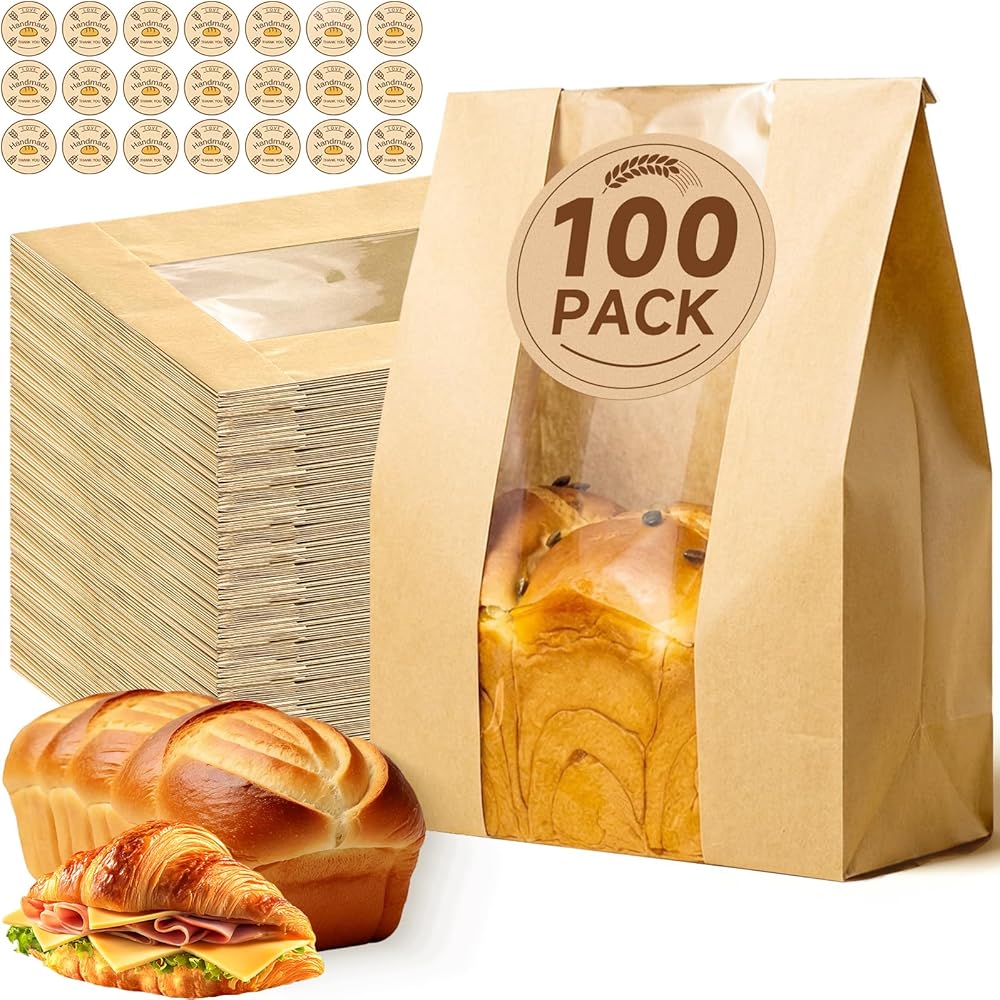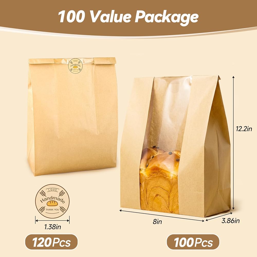 100 Pcs Bread Bags for Homemade Bread with Clear Window & 120 Stickers, Sourdough Bread Bags for Storage of Bread,Cookies & Snacks, Large Bakery Paper Bags