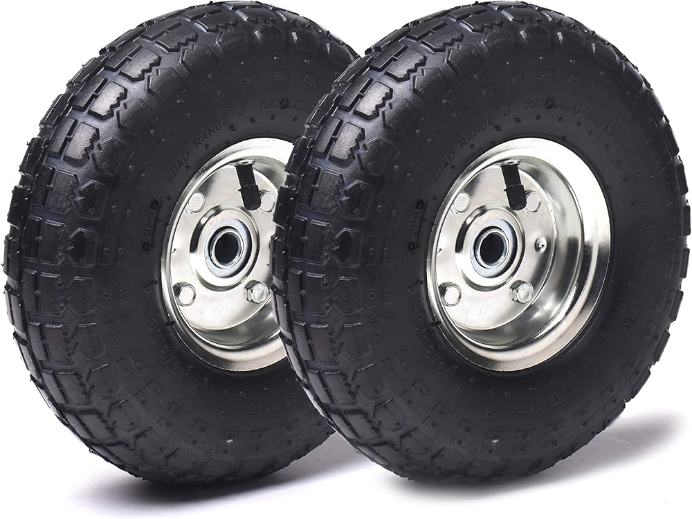 • مجموعة إطارات هوائية عالمية 4.10/3.50-4: مجموعة إطارات هوائية مقاس 10 بوصات (حجم 4.10/3.50-4) مع تجويف محور 5/8 بوصة ومركز إزاحة 2.2 بوصة - متوافقة مع الشاحنات اليدوية والدمى وعربات المرافق وغسالات الضغط والمولدات والعربات وغيرها من المعدات الصغيرة التي تستخدم إطارات أنبوبية مقاس 10 بوصات.