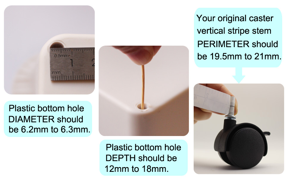 1. يرجى التحقق من أقطار العجلة الأصلية وفتحة الصندوق البلاستيكي بعناية. من المهم بالنسبة لك أن تختار العجلات البديلة ذات الحجم المناسب بشكل فعال.