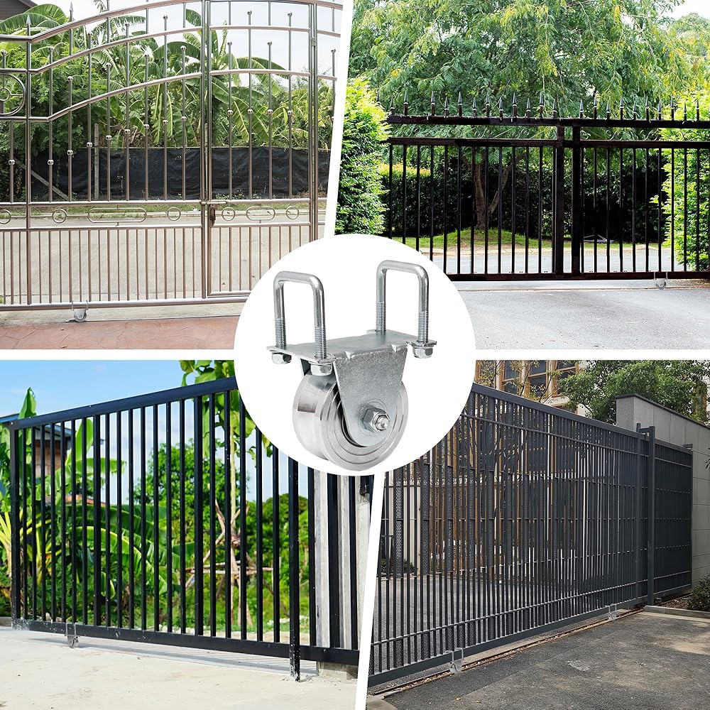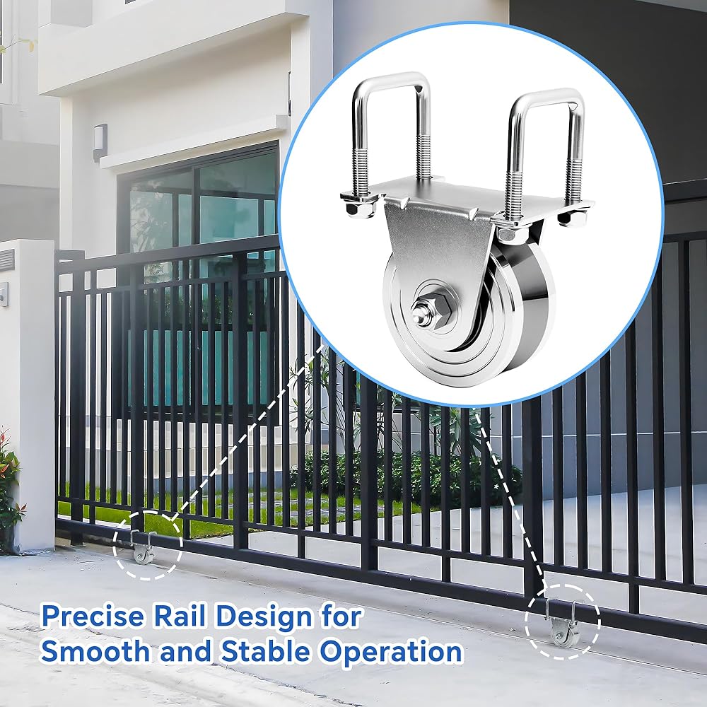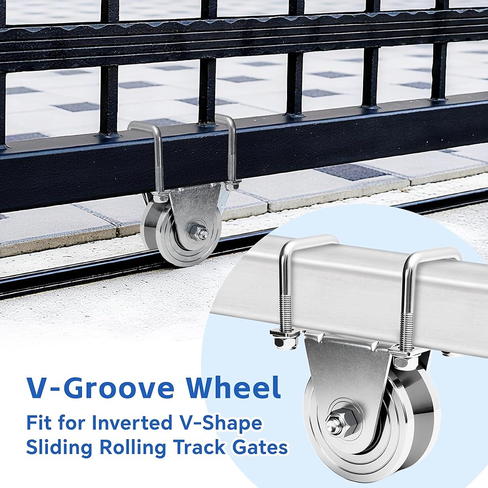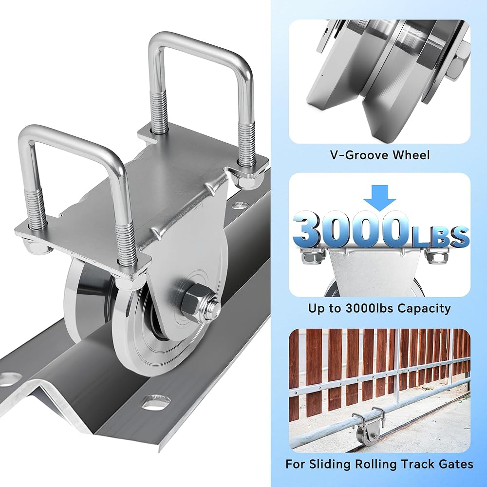 سعة تصل إلى 3000 رطل: تدعم كل بكرة بوابة منزلقة ما يصل إلى 3000 رطل، مما يتيح حركة سلسة يمكن التحكم فيها من أجل النقل الفعال للمعدات الثقيلة. مثالية لبوابات الممرات الكبيرة والأبواب المنزلقة الآمنة مع أنظمة المسار V المقلوبة