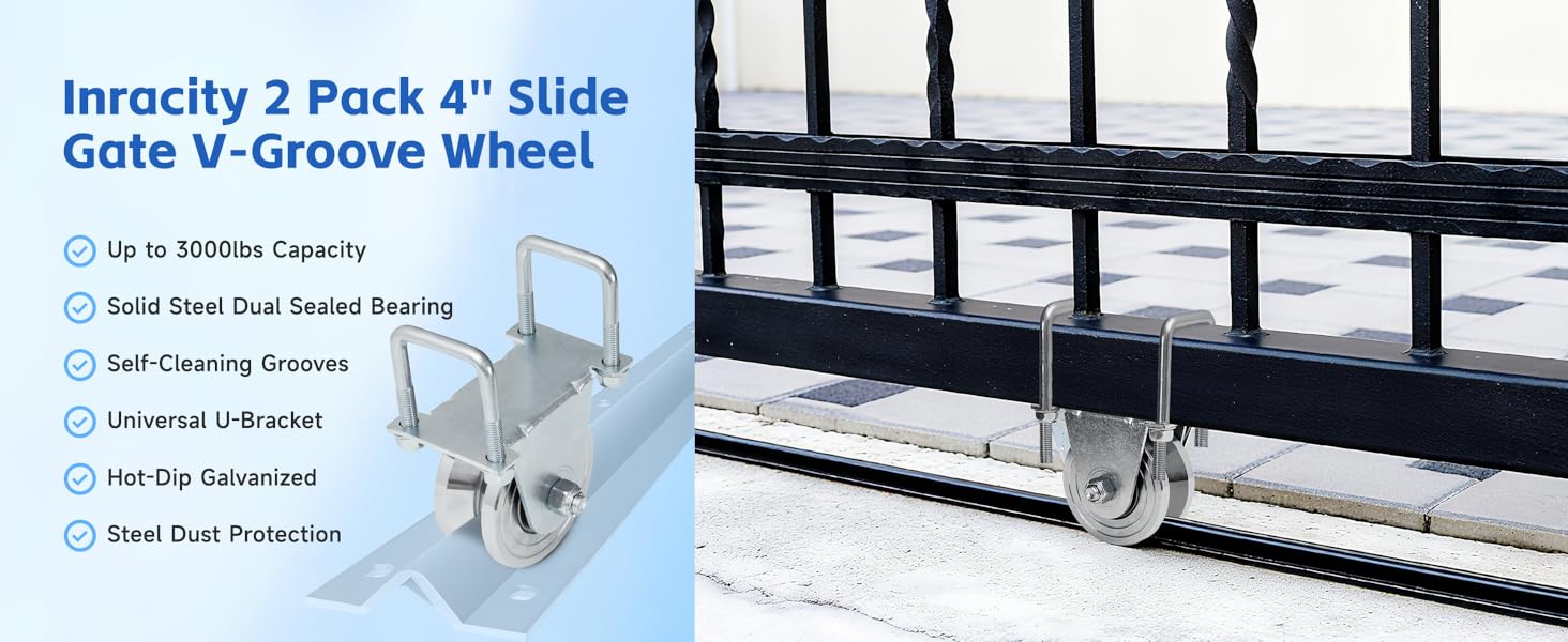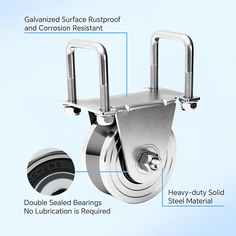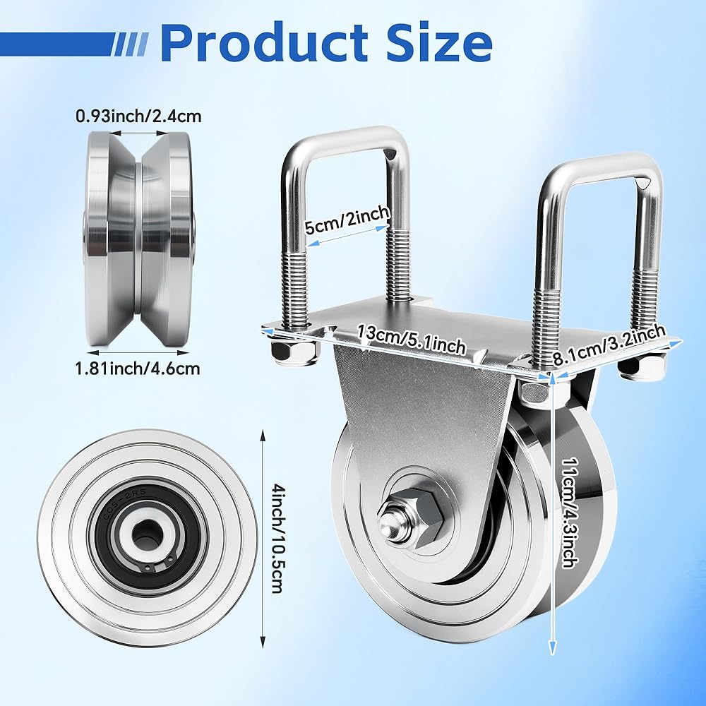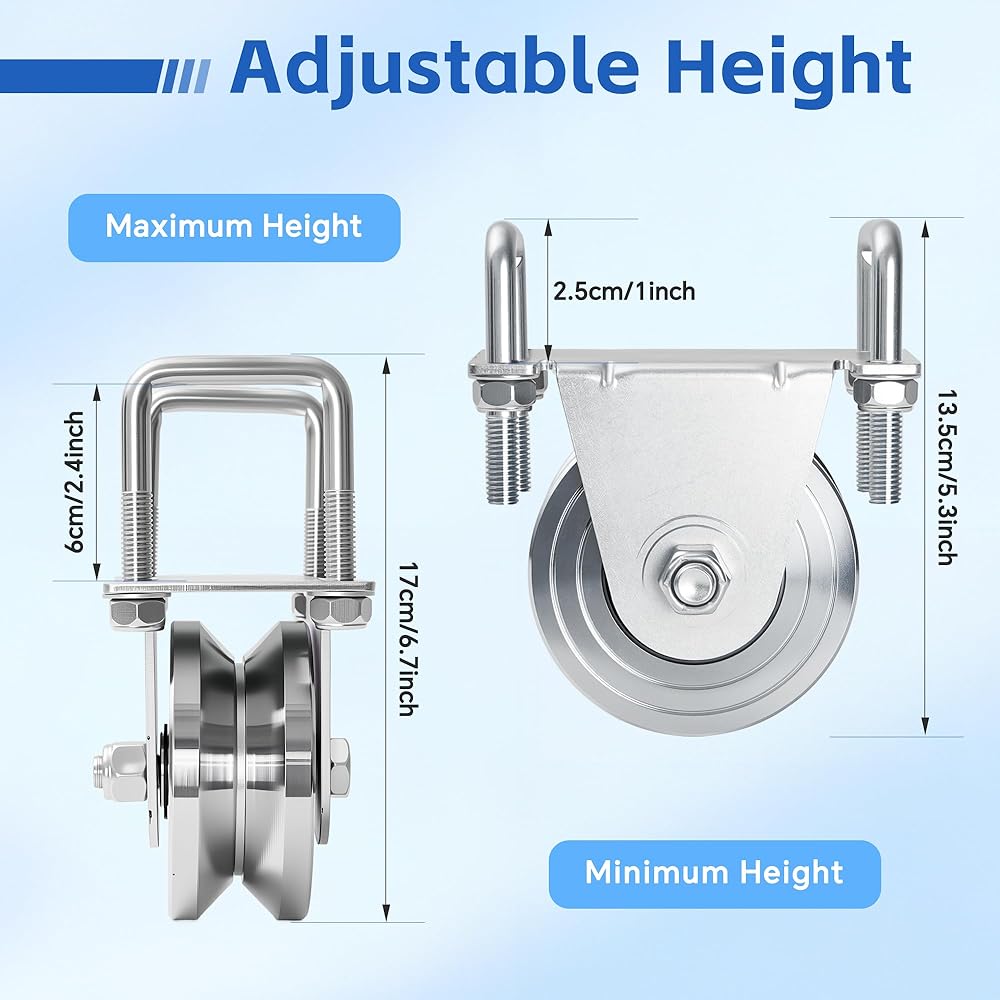 سعة تصل إلى 3000 رطل: تدعم كل بكرة بوابة منزلقة ما يصل إلى 3000 رطل، مما يتيح حركة سلسة يمكن التحكم فيها من أجل النقل الفعال للمعدات الثقيلة. مثالية لبوابات الممرات الكبيرة والأبواب المنزلقة الآمنة مع أنظمة المسار V المقلوبة
