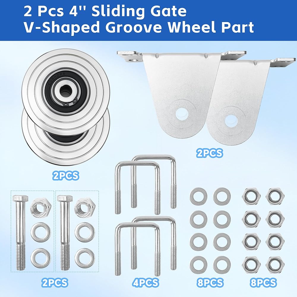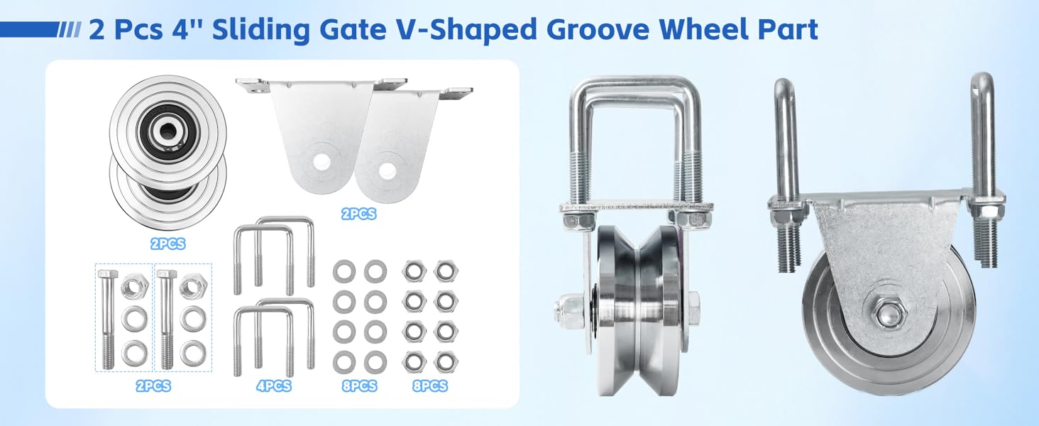 تصميم عالي التحمل: عبوتان من عجلة البوابة المنزلقة ذات الأخدود على شكل حرف V مقاس 4 بوصات مع دعامات تثبيت خارجية ومسامير. يبلغ قطر العجلات 4 بوصات وسمكها 1-13/16 بوصة، وهي مصنوعة من الفولاذ الصلب عالي التحمل للأبواب المنزلقة ذات المسار على شكل حرف V المقلوبة من الدرجة الصناعية.