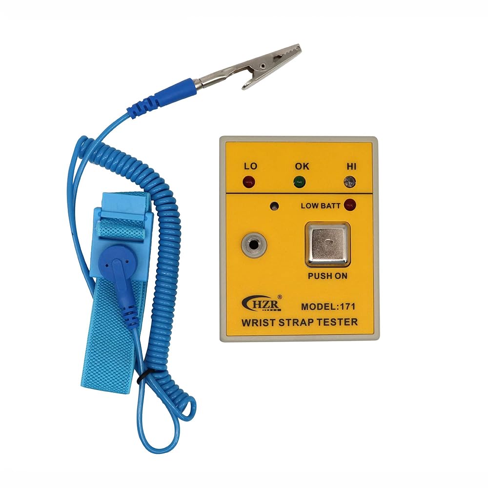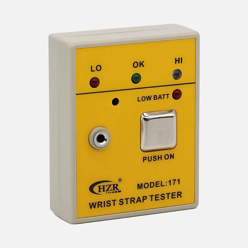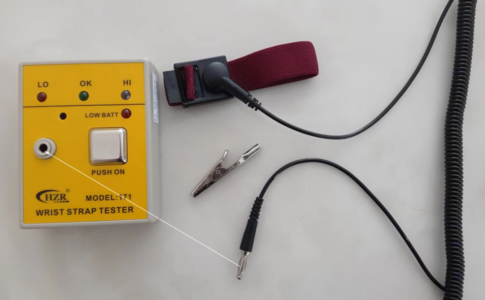 - جهاز اختبار حزام المعصم بزر ضغط بسيط وسريع الاستجابة. حزام المعصم غير متضمن. استخدم أي حزام معصم أرضي قياسي أو سلك مع طرف ذكر بقابس الموز.