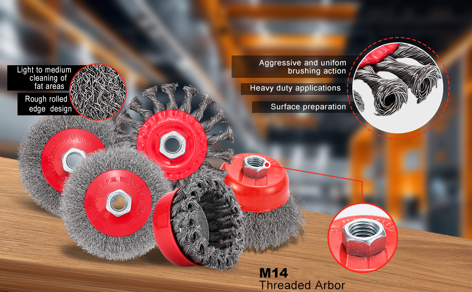 【مواد عالية الجودة】مجموعة عجلات سلك المطحنة الصناعية مصنوعة من أسلاك فولاذية كربونية عالية القوة والفولاذ المقاوم للصدأ. رأس الفرشاة مصنوع من مواد صلبة عالية القوة. السرعة القصوى هي 12,500 دورة في الدقيقة. هذه الفرش السلكية لن تتفكك أو تتآكل بسهولة.
