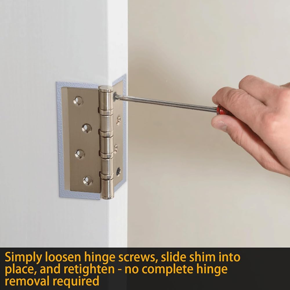 EASY INSTALLATION: Simply loosen hinge screws, slide shim into place, and retighten - no complete hinge removal required