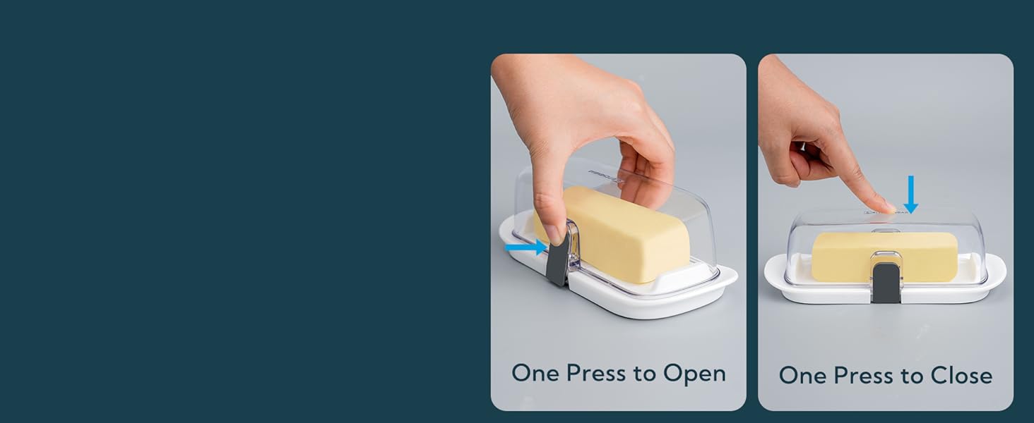 ضغطة واحدة لفتح/إغلاق أبازيم الإغلاق الآمنة: يعمل تصميم مشبك التثبيت على تثبيت الغطاء بالقاعدة بشكل آمن، مما يخلق بيئة محكمة الغلق بشكل أفضل ويضمن عدم سقوط الزبدة. يمكن قفله وفتحه بيد واحدة، مما يجعل التشغيل أسهل. إنه يحمي زبدتك من القطط والغبار والحشرات وأي شيء آخر قد يلوث زبدتك