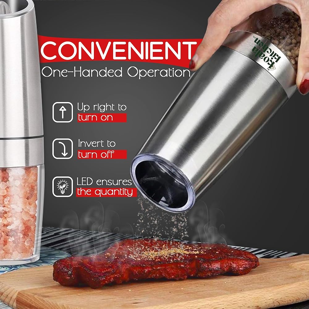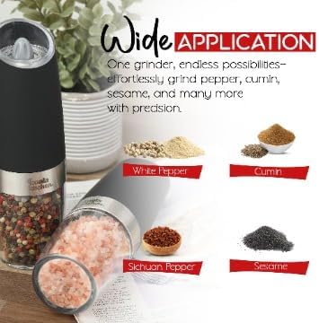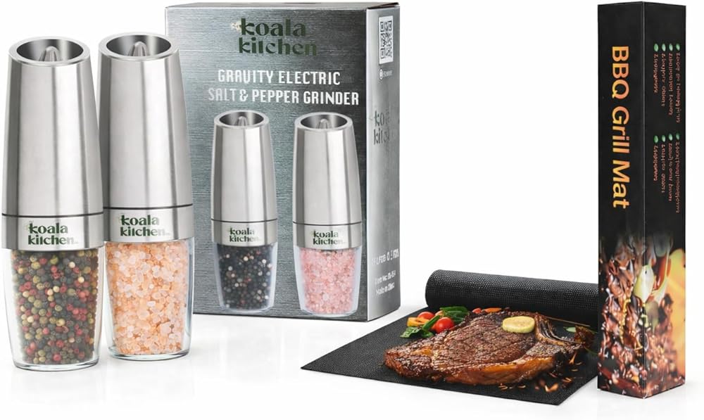 مجموعة مطحنة الملح والفلفل الكهربائية من جرافيتي + سجادات شواء غير لاصقة (5 عبوات) | مطاحن الجاذبية الخشنة القابلة للتعديل مع ضوء LED + بطانات الشواية القابلة لإعادة الاستخدام للشوي بالغاز والفحم والشواء الكهربائي