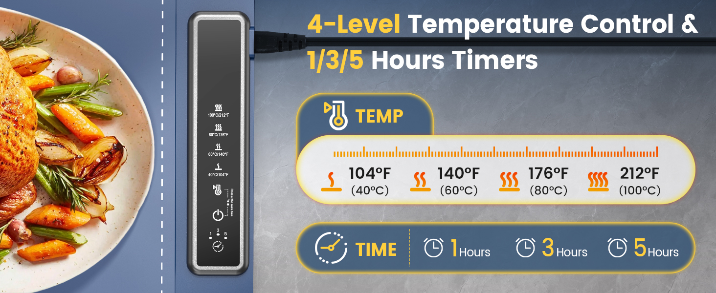 【درجة حرارة 4 مستويات و3 إعدادات للمؤقت】 توفر صينية التسخين الكهربائية هذه 4 خيارات لدرجة الحرارة، 104 درجة فهرنهايت، 140 درجة فهرنهايت، 176 درجة فهرنهايت، و212 درجة فهرنهايت، وتغطي نطاقات منخفضة إلى عالية لتتناسب تمامًا مع احتياجاتك المتنوعة لتدفئة الطعام. بالإضافة إلى ذلك، فإن بساط تدفئة الطعام الخاص بنا مجهز بمؤقت ثلاثي المستويات (1/3/5 ساعات)، مما يحافظ على دفء طعامك ويحافظ على نضارته دون عناء. إنه يعمل بشكل جيد على حد سواء للحفاظ على الطعام دافئًا وتسخين درجة الحرارة اللطيفة، مما يزيد من تجربة تناول الطعام الخاصة بك مع كل استخدام.
