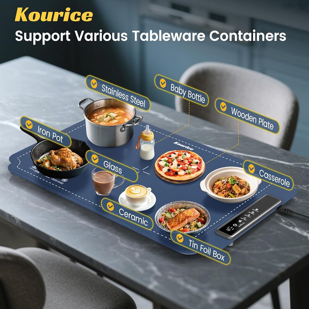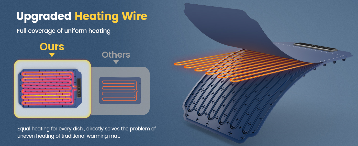 【تسخين سريع لكامل السطح لمدة 10 ثوانٍ】 تتميز حصيرة تدفئة الطعام من كوريس بتقنية سلك تسخين مطورة، مما يضمن توزيع سريع ومتساوي للحرارة على السطح بأكمله، باستثناء الحافة المضادة للحرق. يعمل هذا التصميم على حل مشكلة التسخين غير المتساوي الموجودة في صواني التسخين الكهربائية التقليدية بشكل فعال. كما أنه يدعم وضع الأطباق الكبيرة والصغيرة، مما يزيد من كفاءة المساحة في سخان الطعام. ملاحظة: يجب توصيل هذا المنتج وهو غير قابل لإعادة الشحن. أبعاد المنتج (تقريبًا): 23.6 × 15 بوصة (60 × 38 سم)