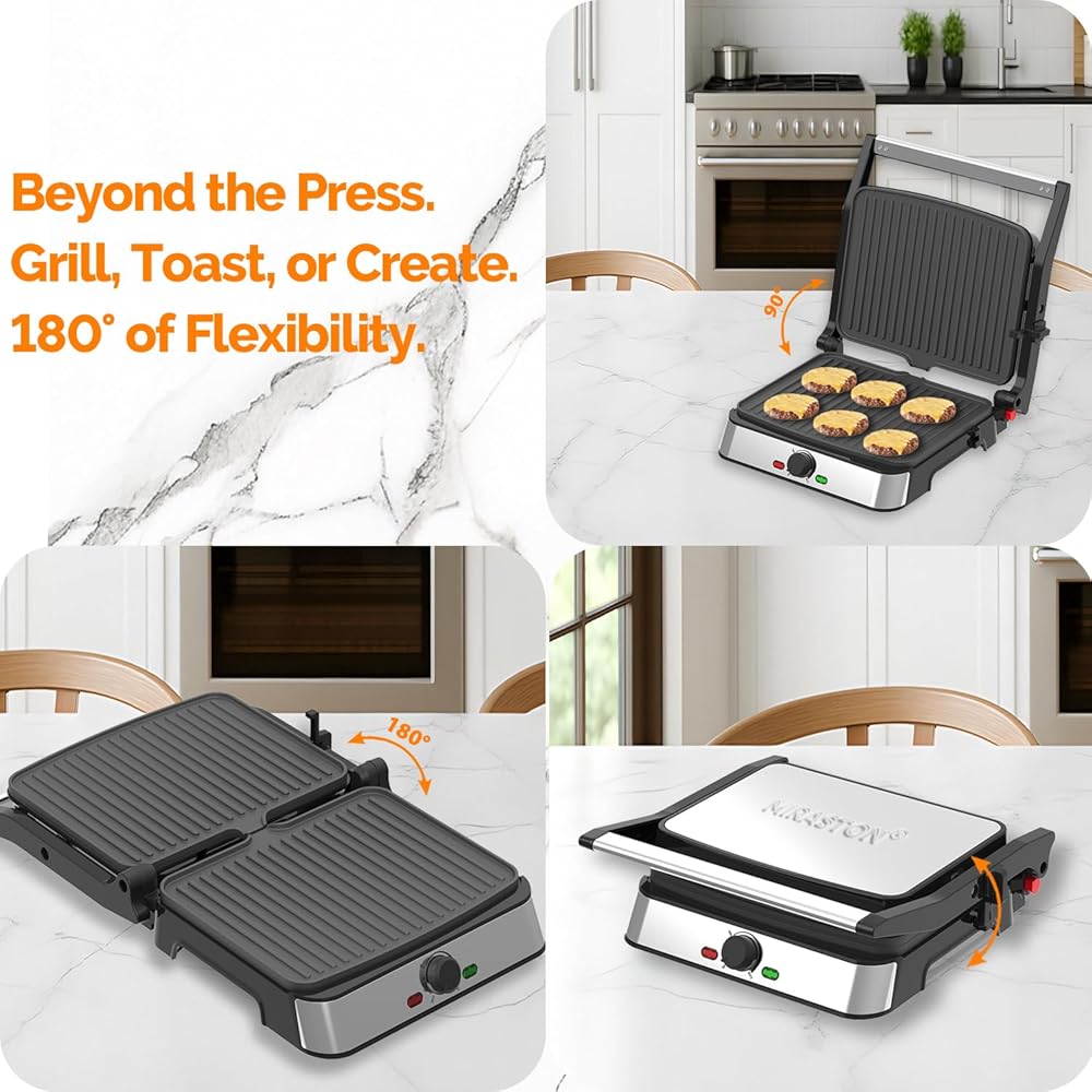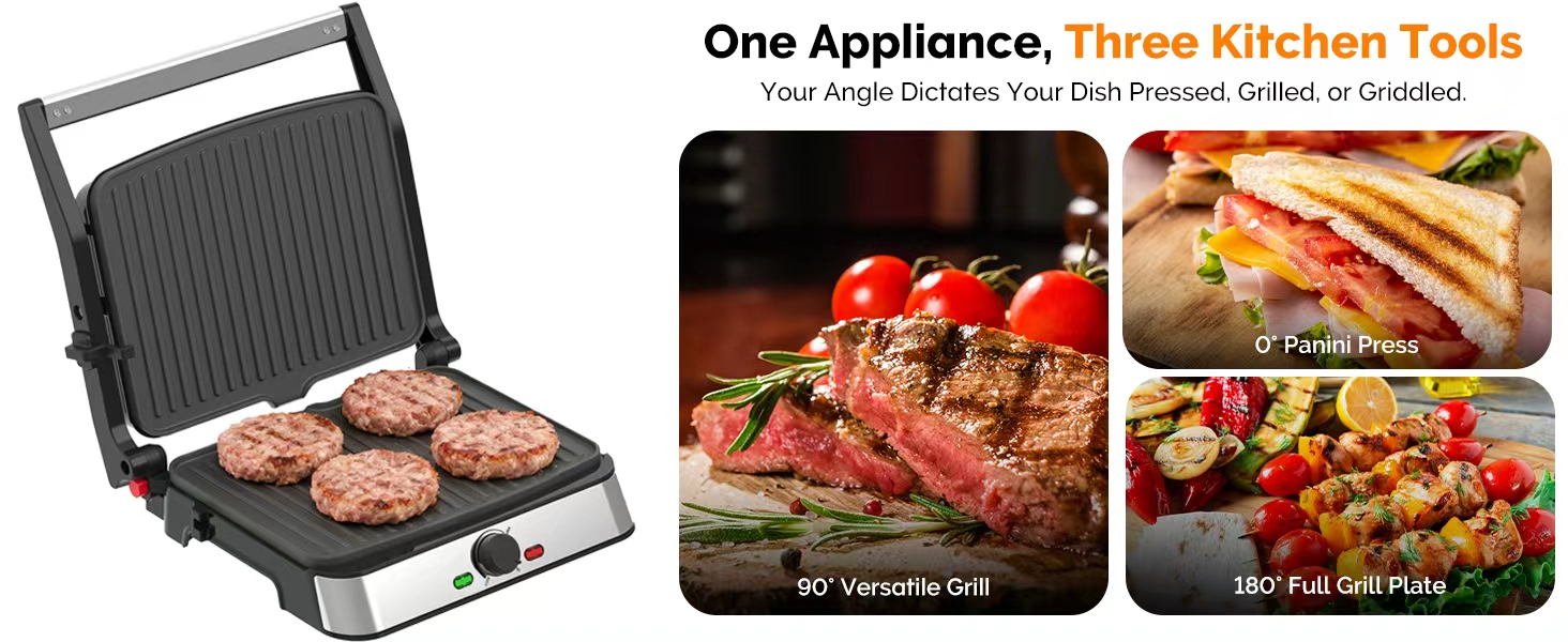 • متعددة الاستخدامات 3 في 1 في تطبيق ذكي واحد: افتح ثلاث وظائف للطهي باستخدام الألواح الفريدة القابلة للتعديل بزاوية 180 درجة: ضعها عموديًا للشوي، أو أغلقها للضغط على البانيني، أو ضعها بشكل مسطح تمامًا لإنشاء سطح طهي كبير للفطائر واللحم المقدد.