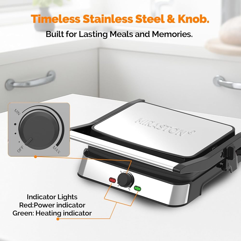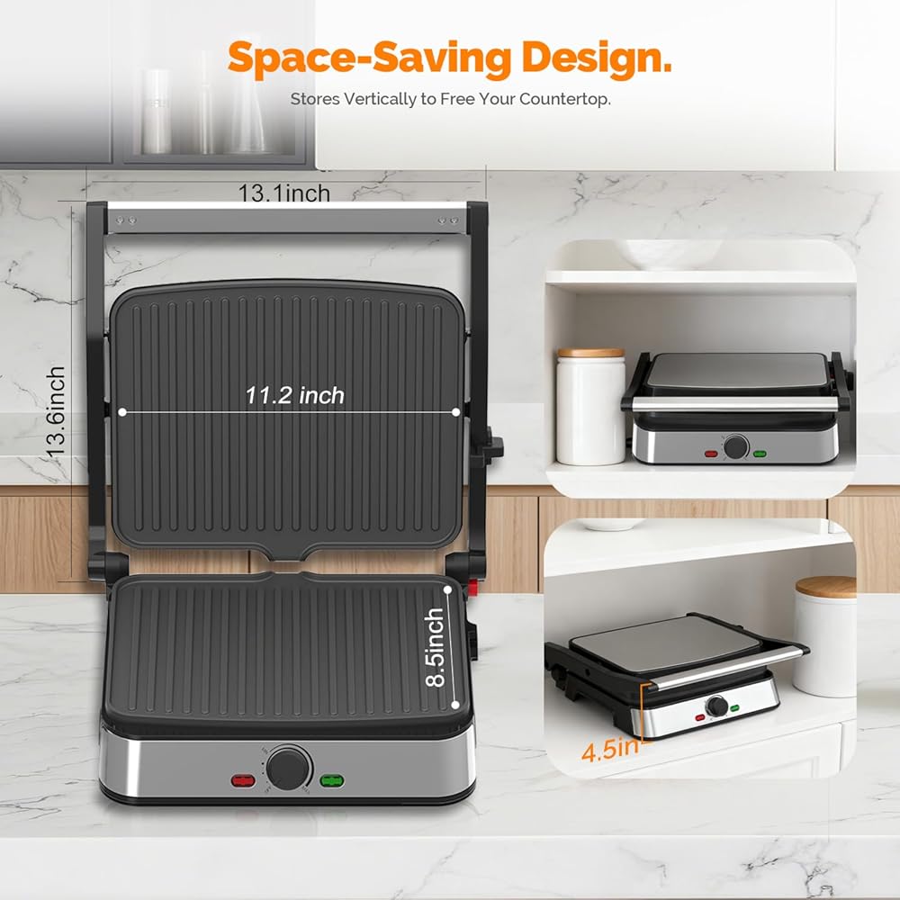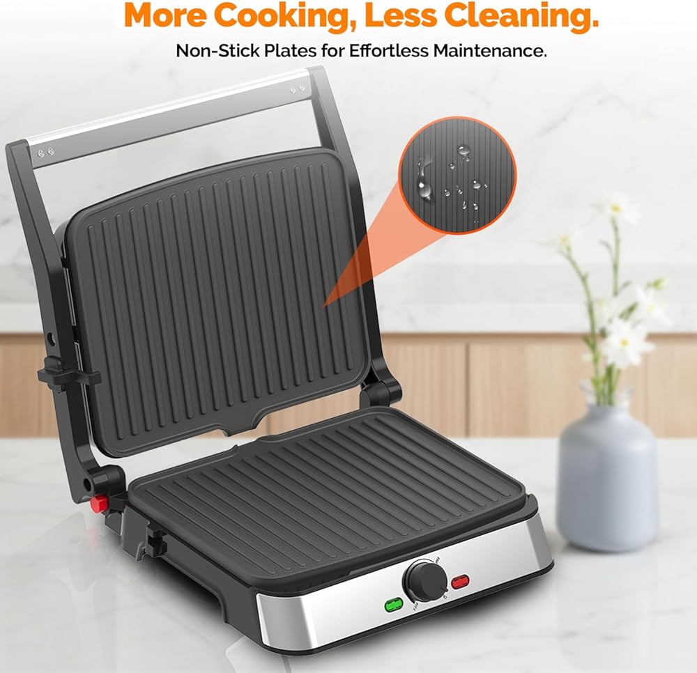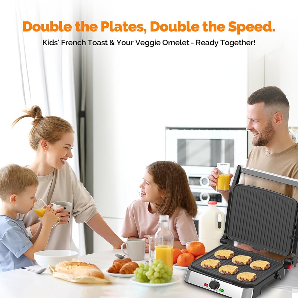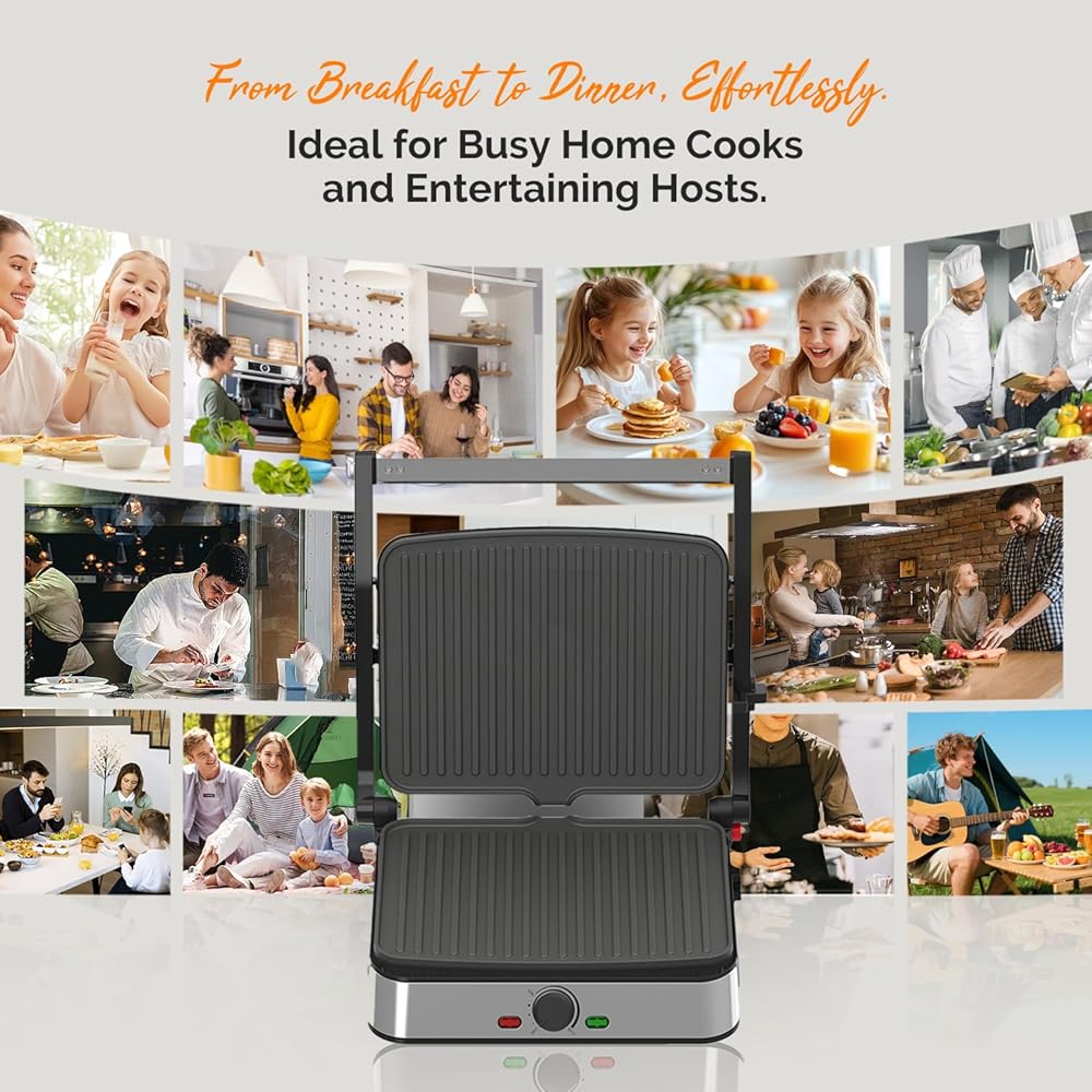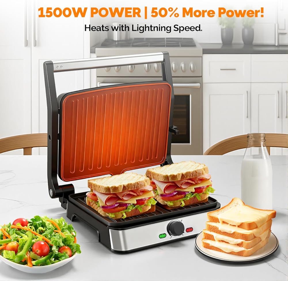• 【قوة احترافية بقدرة 1500 واط للحصول على نتائج سريعة】: استعد لتناول الطعام بشكل أسرع! يصل نظام التسخين القوي بقدرة 1500 واط بسرعة إلى درجة الحرارة المثالية، ويقدم السندويشات المشوية واللحوم المشوية بشكل مثالي في دقائق - وهو مثالي للصباح المزدحم ووجبات الغداء السريعة.