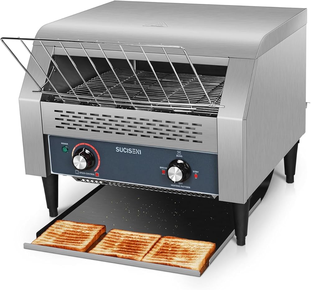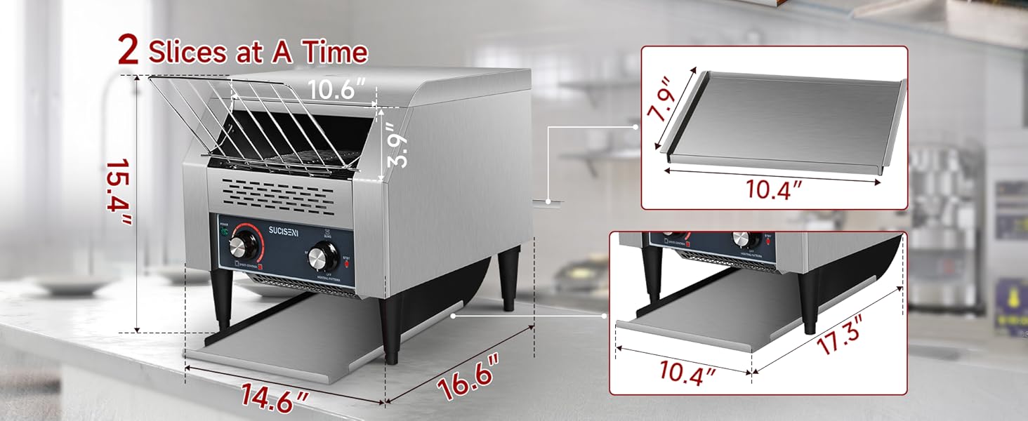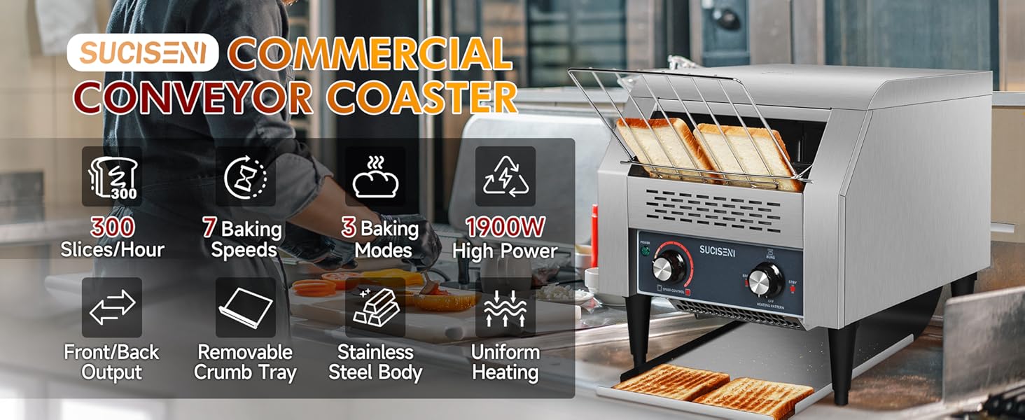 300 شريحة/ساعة: تتميز محمصة الخبز التجارية SUCISENI بتصميم حزام ناقل من الفولاذ المقاوم للصدأ بدرجة الطعام، مما يحقق تحميصًا فعالاً يصل إلى 300 شريحة في الساعة، مما يلبي متطلبات الحجم الكبير في ساعات الذروة.
