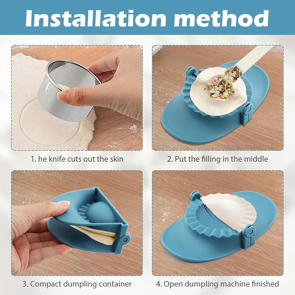 【EASY TO USE】In just four steps, even a novice can easily make dumplings. Take out the dumpling making tools; add dumpling wrappers and fillings; gently fold and press the dumpling maker to shape; take out the dumplings after they are formed.