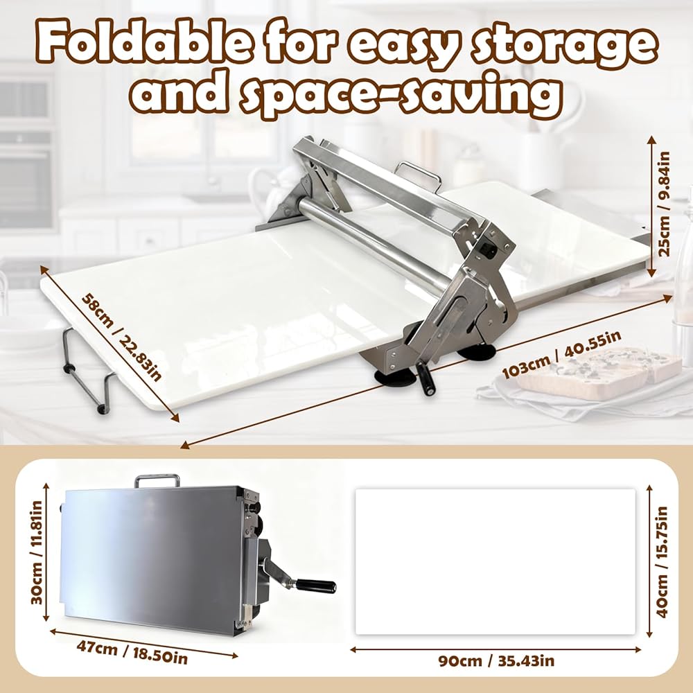 تصميم مدمج وانسيابي: الأبعاد غير المطوية (بما في ذلك المقبض) هي 42 × 22.5 × 9.5 بوصة، بينما تبلغ أبعاد التخزين 18.5 × 9.5 × 4.2 بوصة فقط. يبلغ قياس السطح المتداول 40.9 × 15.5 بوصة. يتم تفكيك آلة اللف هذه وإعادة تجميعها بسهولة استثنائية - يمكن لأي شخص إكمال العملية في ثوانٍ، مما يوفر راحة هائلة لاستخدام المطبخ.