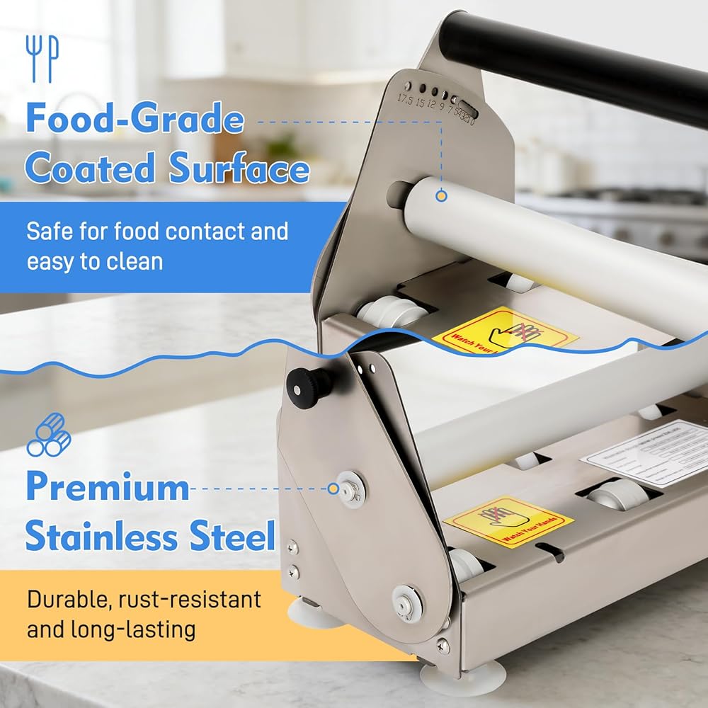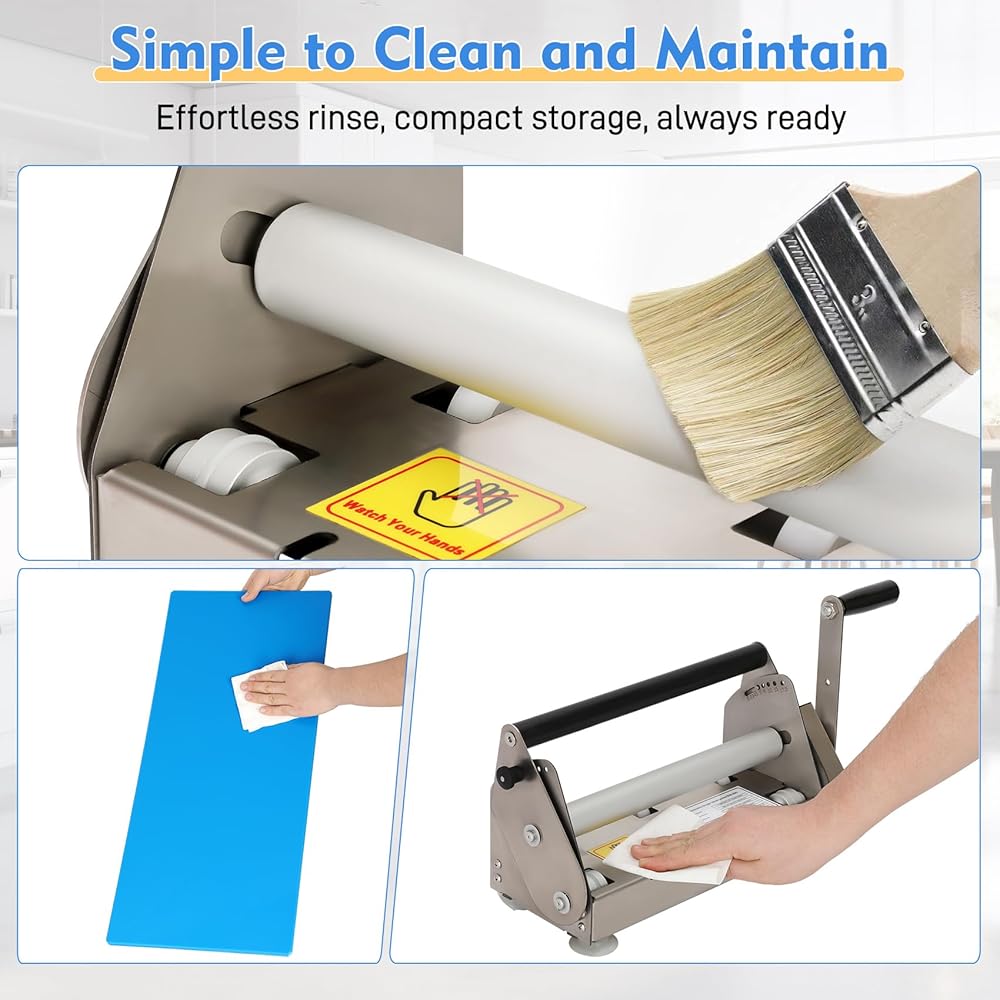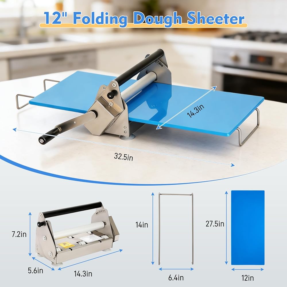 تصميم مدمج للاستخدام المنزلي: تم تصميمه كآلة فرد عجينة موفرة للمساحة للمطابخ المنزلية، يتناسب الهيكل القابل للطي مقاس 12 بوصة بسهولة مع معظم أسطح العمل ويمكن طيه بشكل صغير للتخزين المريح في الخزانات أو مساحات المطبخ الصغيرة!