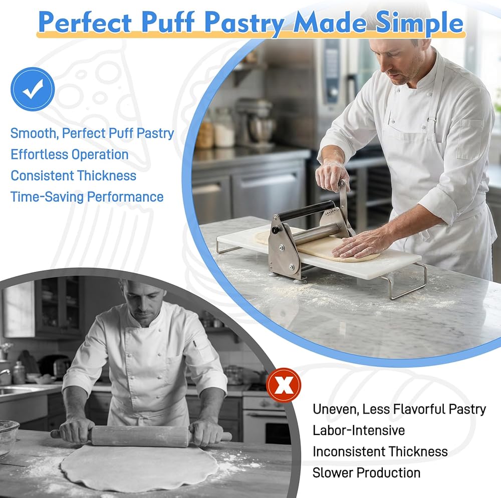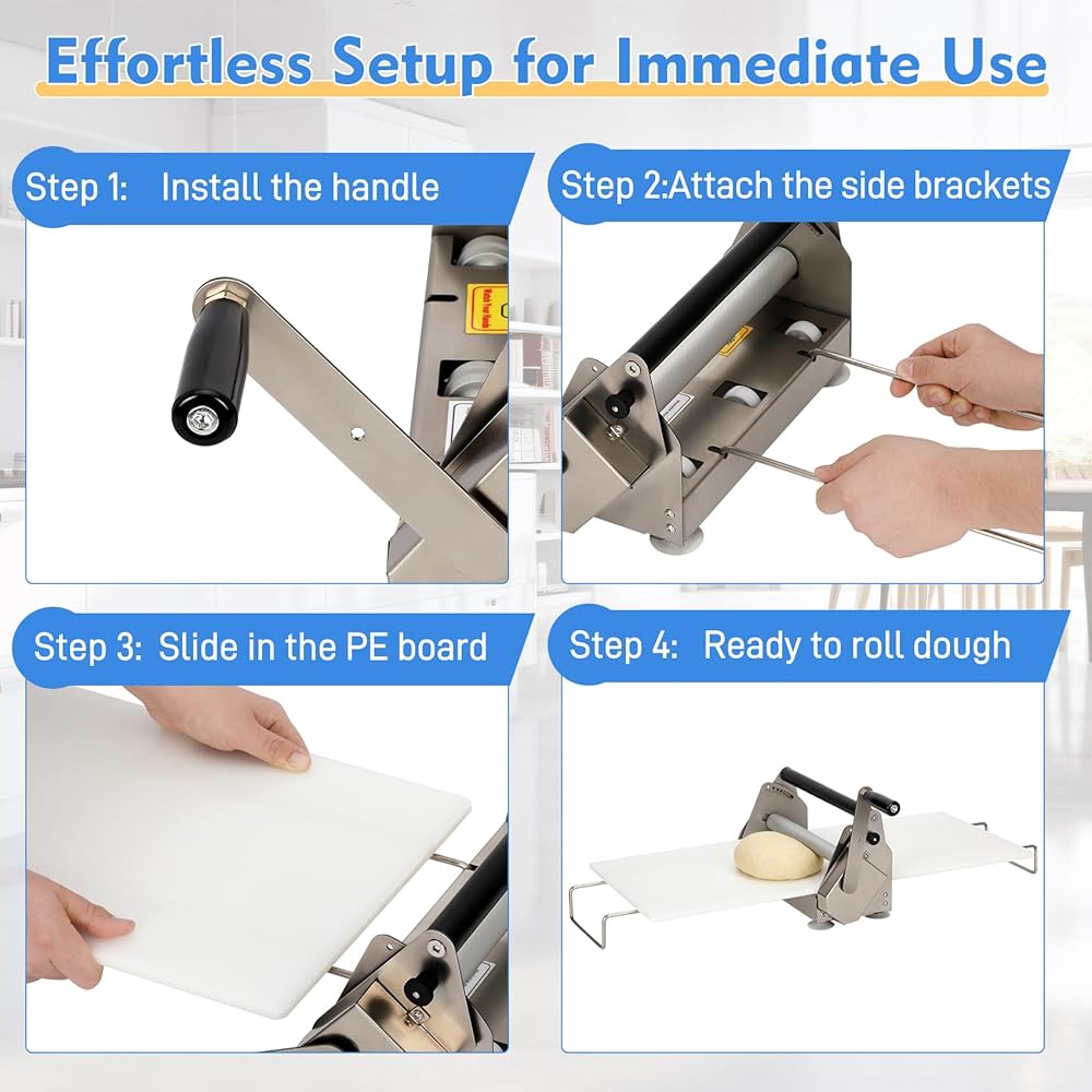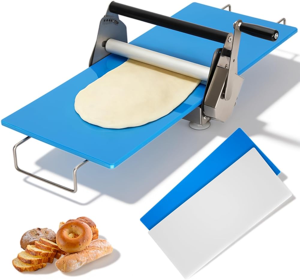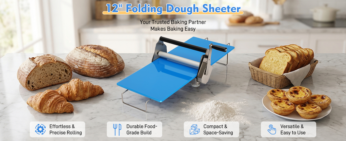 تصميم مدمج للاستخدام المنزلي: تم تصميمه كآلة فرد عجينة موفرة للمساحة للمطابخ المنزلية، يتناسب الهيكل القابل للطي مقاس 12 بوصة بسهولة مع معظم أسطح العمل ويمكن طيه بشكل صغير للتخزين المريح في الخزانات أو مساحات المطبخ الصغيرة!