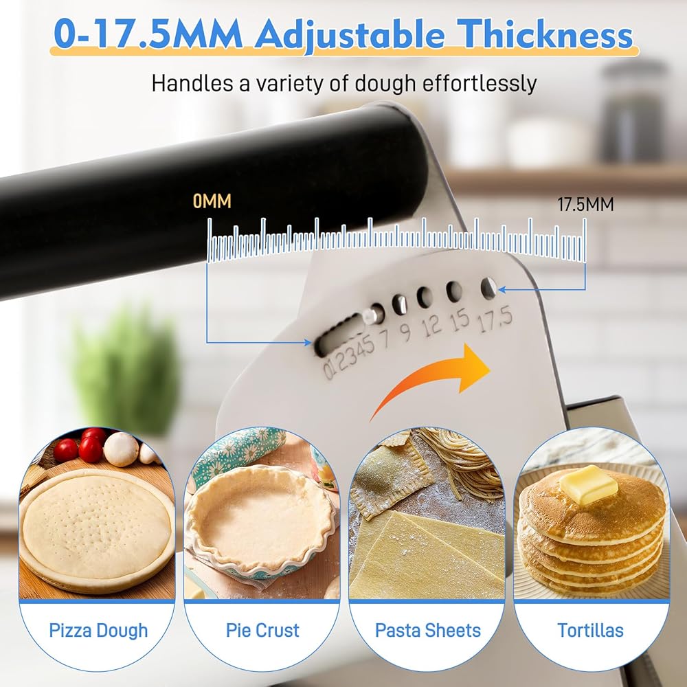 التحكم الدقيق في السُمك: تتميز ماكينة لف العجين بإعدادات سُمك قابلة للتعديل من 0 إلى 17.5 مم، مما يسمح بدحرجة متسقة ودقيقة لعجينة البيتزا والكرواسان والمعجنات المنتفخة والمعكرونة والبسكويت وعجين الخبز والعديد من وصفات الخبز الأخرى.