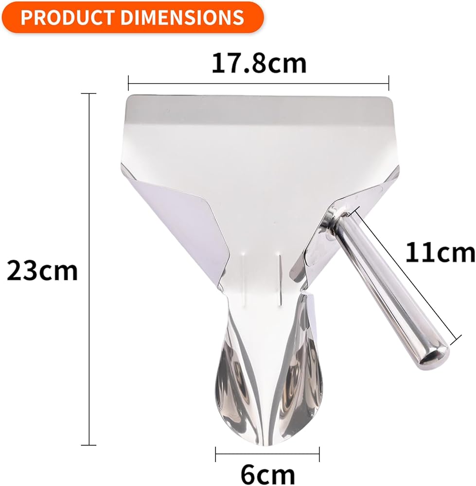 • حجم مثالي مطور: يبلغ طول مغرفة الفشار 23 سم / 9 بوصة، وعرض المدخل 17.8 سم / 7 بوصة وعرض المخرج 6 سم / 2.36 بوصة. وهو الحجم الأكثر ملاءمة للمجارف لأحجام أكبر من أكياس الفشار في معظم المطاعم. يبلغ طول المقبض المصنوع من الفولاذ المقاوم للصدأ 11 سم / 4.33 بوصة، وهو مقبض أطول لمزيد من الراحة في الاستخدام.