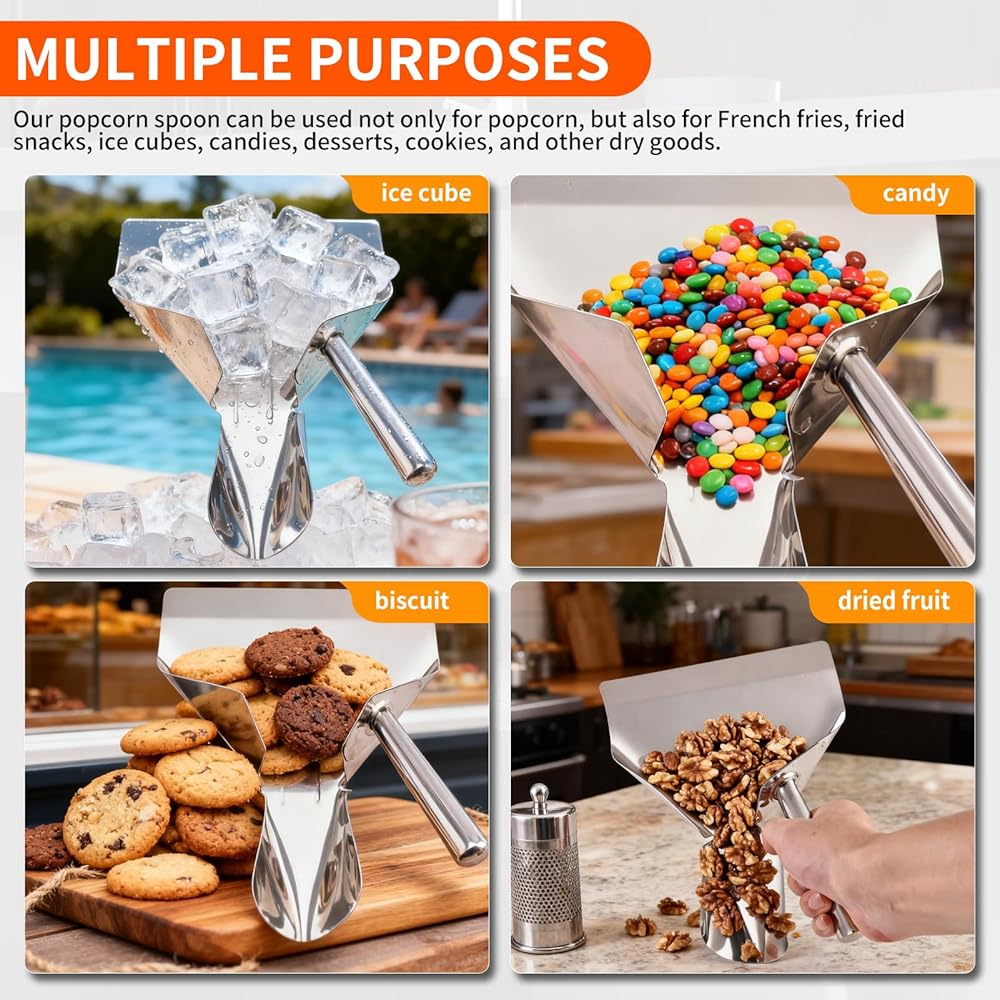 • استخدامات متعددة: مغرفة الفشار الخاصة بنا ليست فقط للفشار، بل يمكنها أيضًا تقديم البطاطس المقلية والوجبات الخفيفة المقلية ومكعبات الثلج والحلوى والبسكويت وغيرها من السلع الجافة. ويمكن استخدامه أيضًا لرش التوابل والجبن والملح والفلفل والقرفة والسكر وغيرها من الإضافات على الطعام.