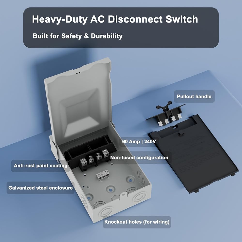 BRILLTECH Pull-Out Disconnect Switch 60AMP 240V Non-Fused, 1-Phase, 3-Wire, 2-Pole, Type 3R, Disconnect Plastic Electronic Components Fused Disconnect Box, UL Listed
