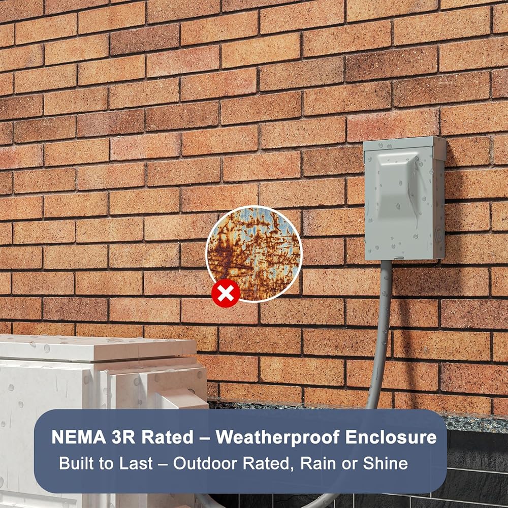 • Rugged Metal Case, Pull-out Switch, 240VAC, 60A, 1- Phase, 3-Wire, 2-Pole, Protection Class, Type 3R, for Outdoor Use, UL Certified for Safety