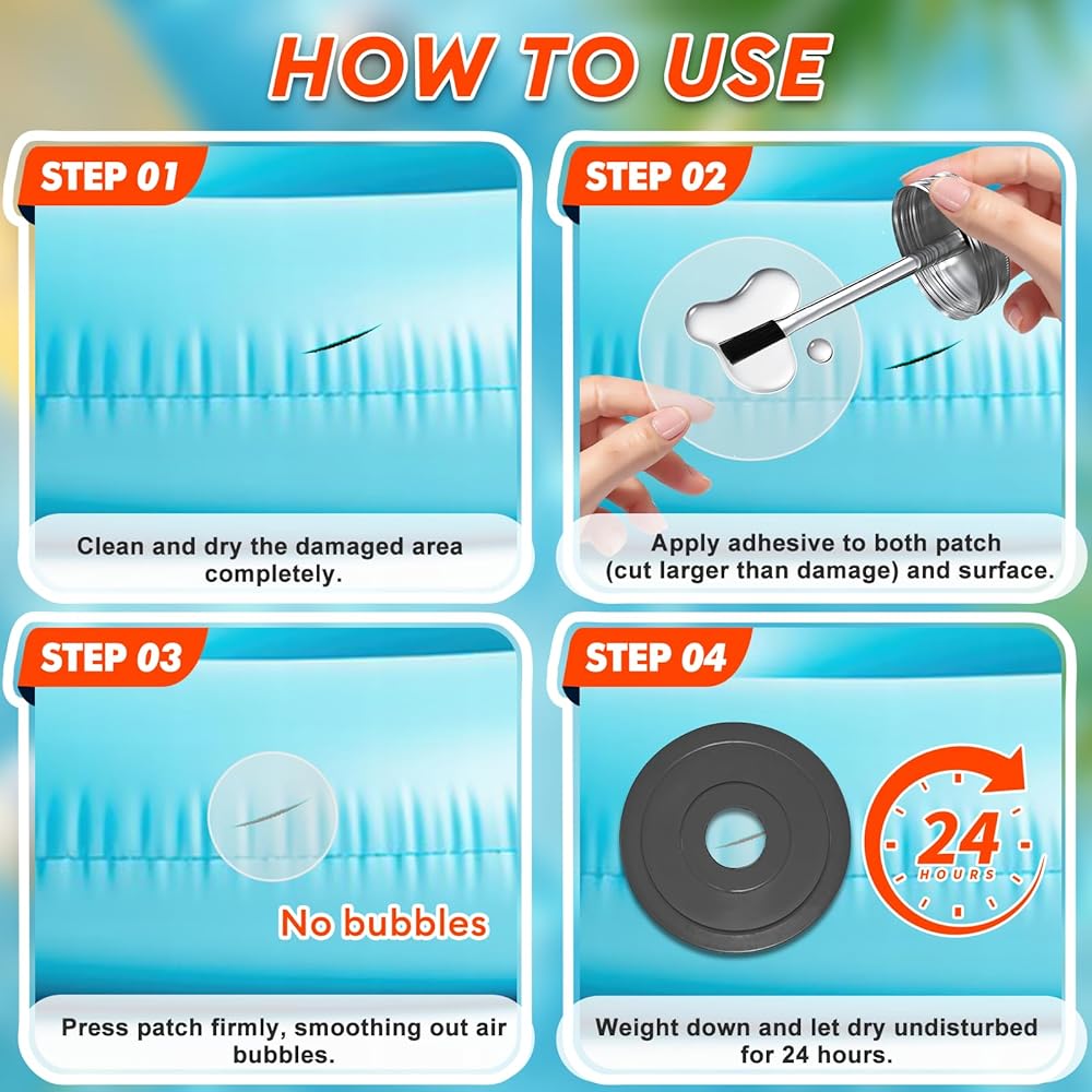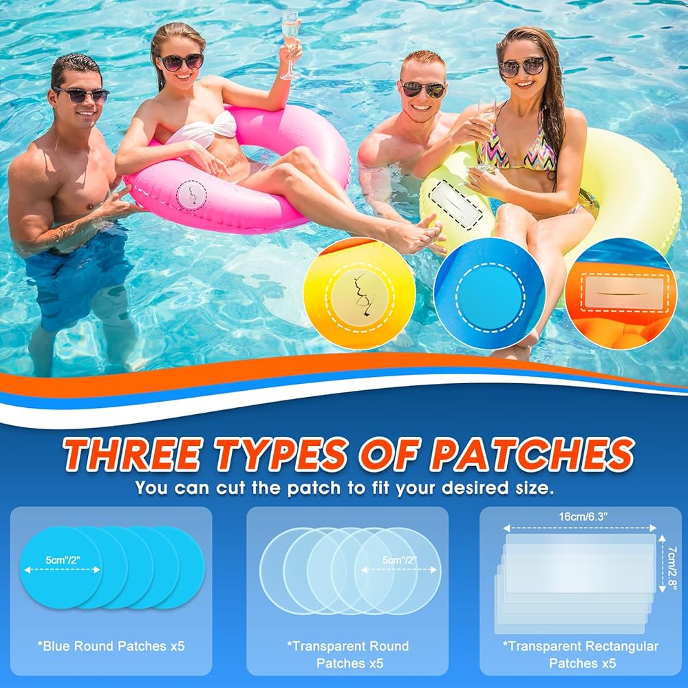 【حل إصلاح مزدوج】يأتي غراء الفينيل اللاصق الخاص بنا مع رقع إصلاح زرقاء وشفافة لتلبية الاحتياجات المتنوعة، مما يحسن بشكل كبير من كفاءة الإصلاح وجودة اللمسة النهائية. تتميز الرقع الزرقاء بأنها مقاومة للخدش والتشوه، مما يجعلها متوافقة تمامًا مع معظم بطانات حمام السباحة. تجمع الرقع الشفافة بين المظهر الجمالي ومقاومة الأشعة فوق البنفسجية، وتمنع الاصفرار بشكل فعال، وهي مثالية للإصلاحات حيث يكون المظهر أمرًا بالغ الأهمية.