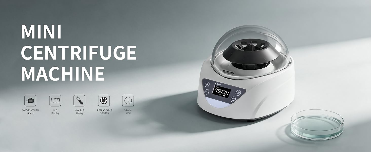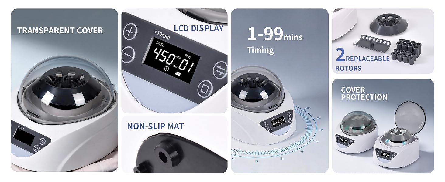 التحكم الدقيق - احصل على القيادة الكاملة من خلال شاشة LCD الواضحة. يمكنك ضبط السرعة المطلوبة ووقت التشغيل ومراقبتها بسهولة (1-99 دقيقة) للحصول على نتائج دقيقة وقابلة للتكرار باستخدام جهاز الطرد المركزي البديهي هذا.