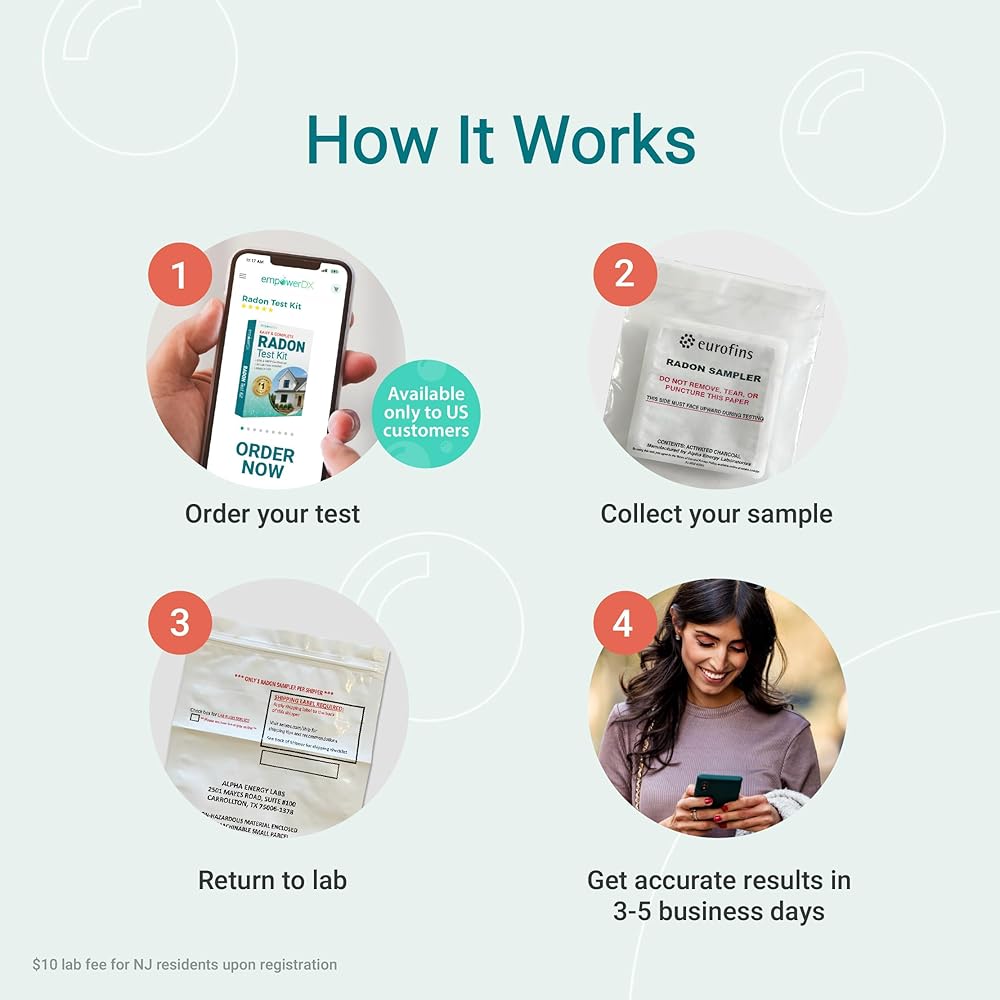 • عملية سهلة من 3 خطوات - اطلب مجموعتك واجمع العينة وأعدها إلى مختبرنا باستخدام أي شركة نقل من اختيارك. يدفع سكان نيوجيرسي رسوم المختبر التي تفرضها الدولة بقيمة 10 دولارات عند التسجيل.