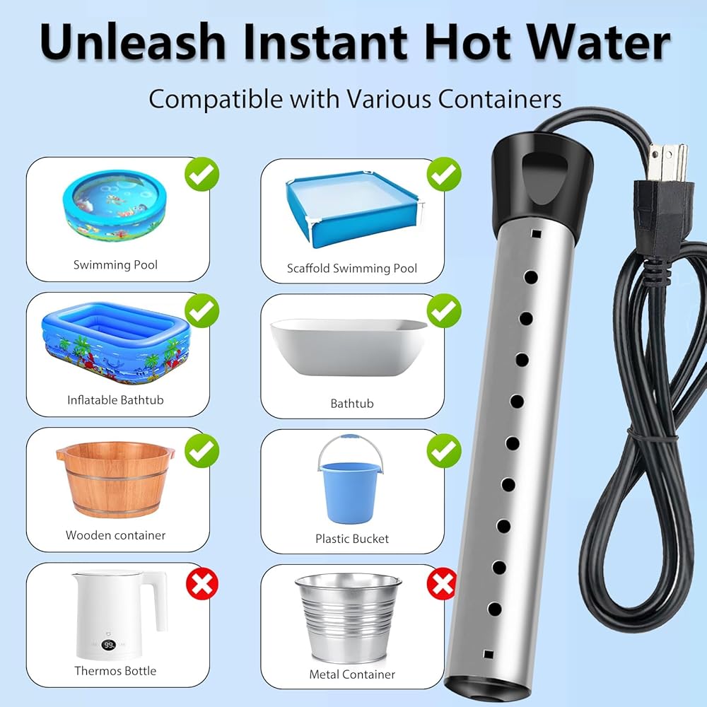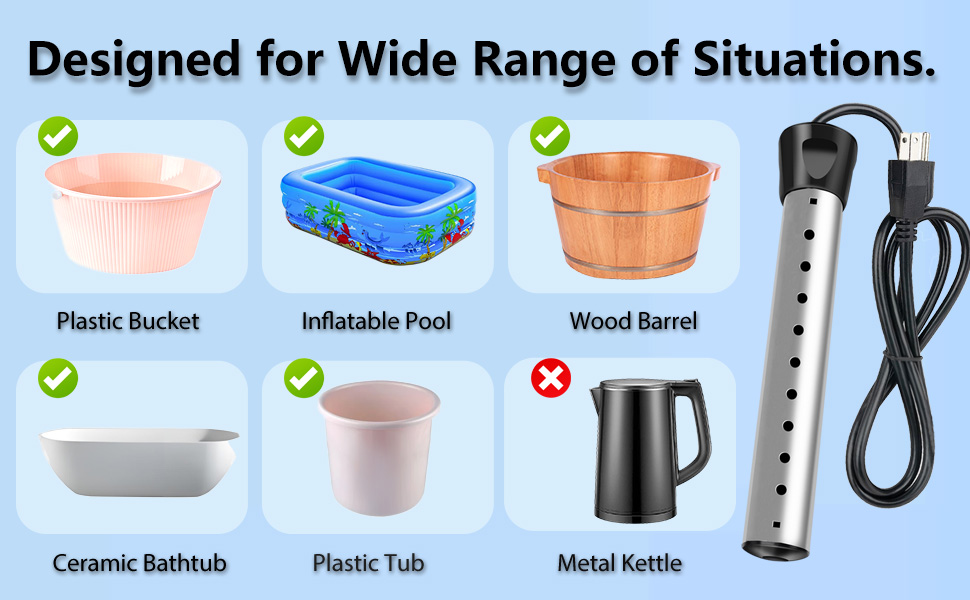 【قابل للتطبيق على نطاق واسع】سخان المياه المحمول هذا مناسب لمجموعة متنوعة من الحاويات غير الموصلة بما في ذلك الدلاء والأحواض وأحواض الاستحمام وحمامات السباحة الصغيرة (وليس لحاويات الحديد). رائعة للاستخدام في المنزل والمزارع وإزالة ثلج السيارة والغسيل الشتوي والأنشطة الخارجية.
