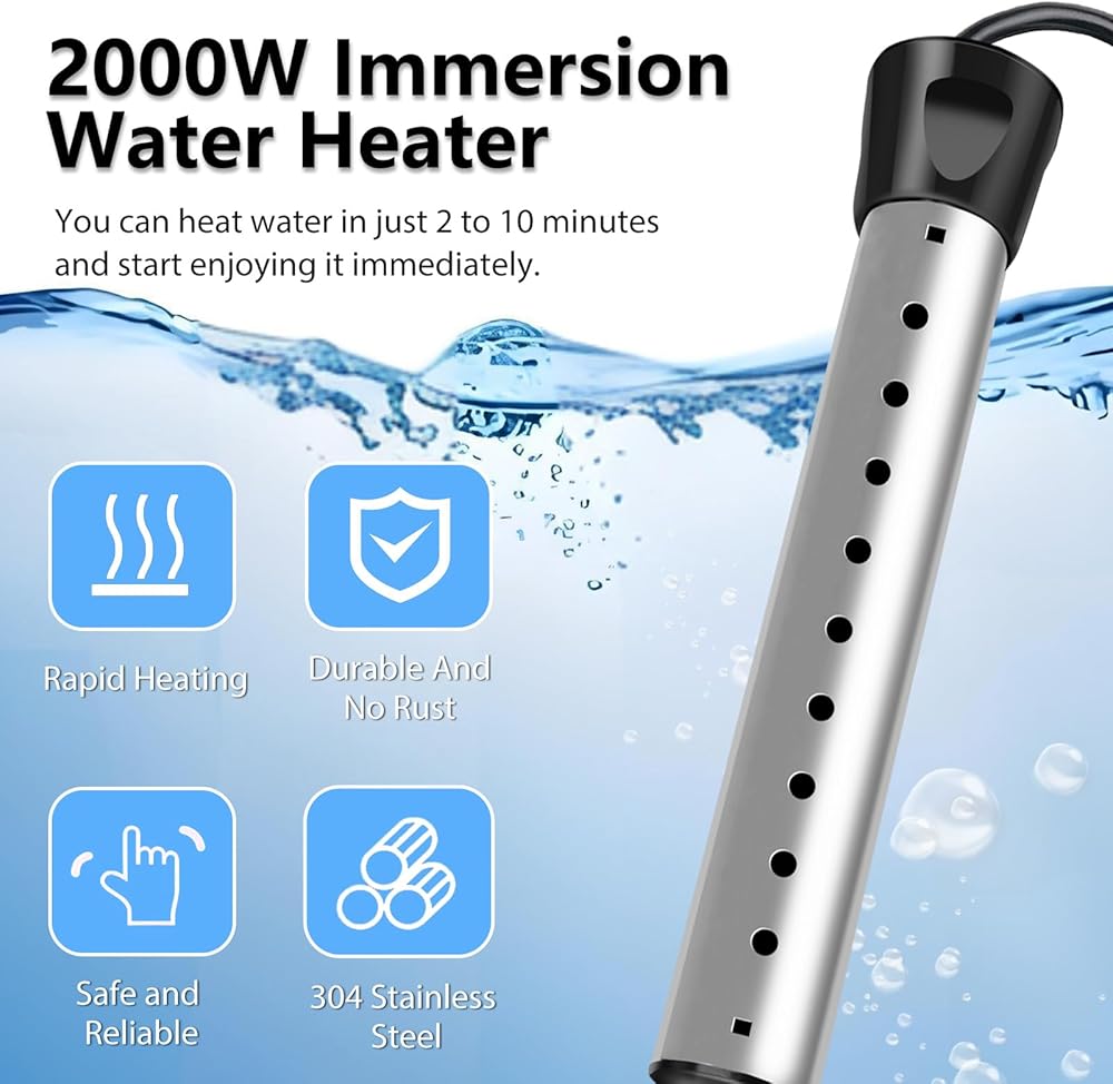 سخان مياه غاطس 2000 وات، سخان مياه كهربائي محمول مع 304 من الفولاذ المقاوم للصدأ، سخان تسخين سريع مع مقياس حرارة، مثالي للدلو وحوض الاستحمام وحمام السباحة الصغير والمنزل والمزارع والتخييم والاستخدام الخارجي