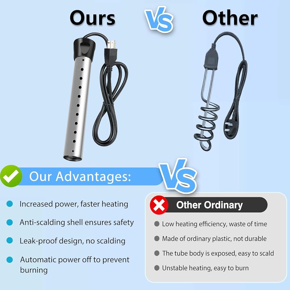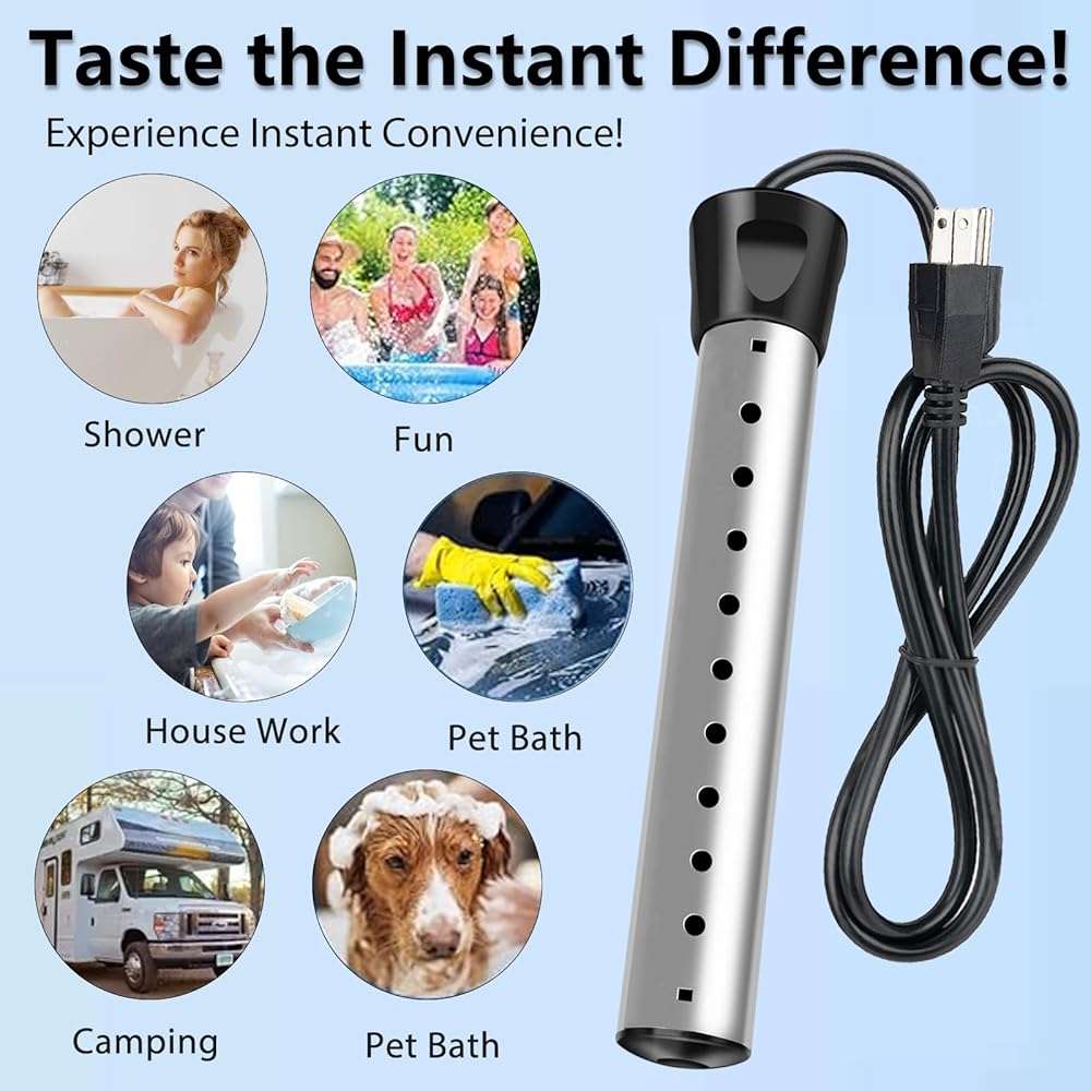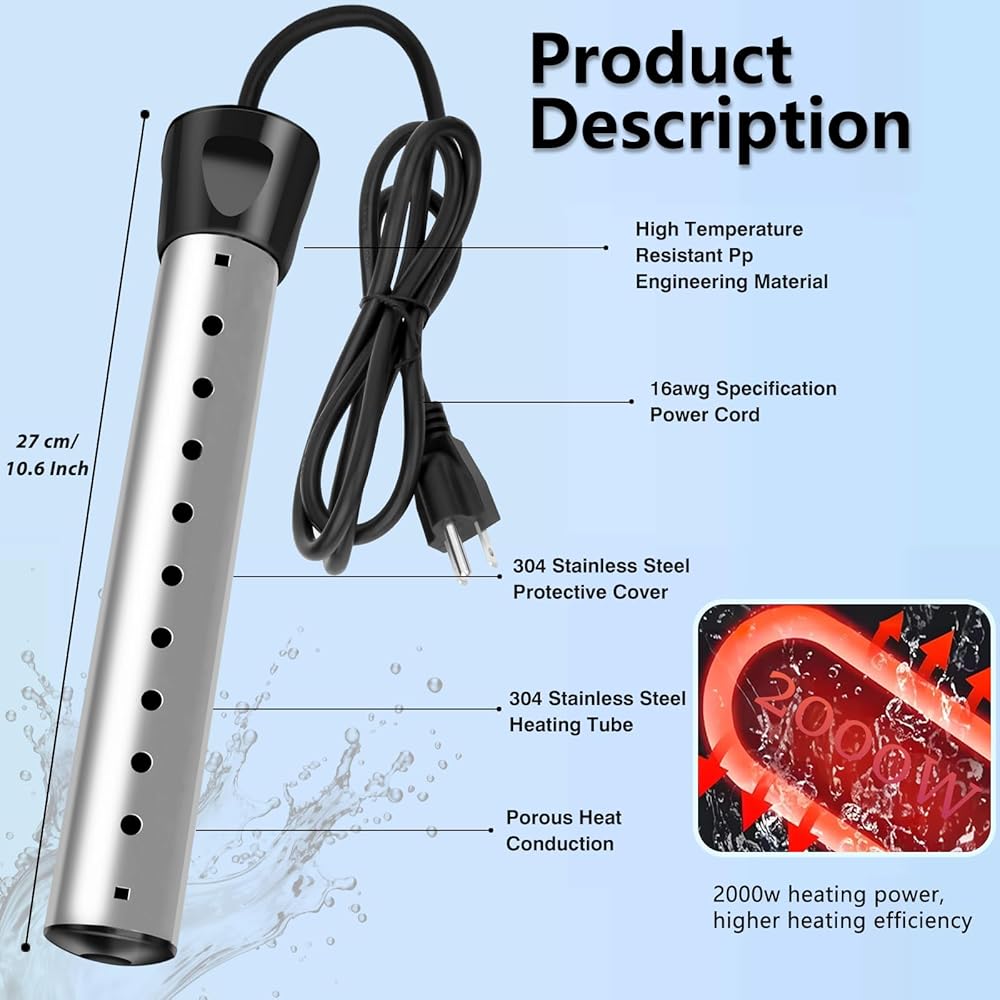 تسخين سريع 2000 وات بسعة 5 جالون: مع تصميم عالي الطاقة 2000 وات وتوافق مع الجهد الكهربي الواسع 110-125 فولت، يقوم سخان المياه الغاطس هذا بتسخين 5 جالون من الماء بسرعة في دقائق معدودة، مما يوفر وقتك واستهلاك الكهرباء، مناسب لأحواض الاستحمام وأحواض الاستحمام الساخنة والدلاء وحمامات السباحة ودش التخييم واحتياجات التدفئة الأخرى.