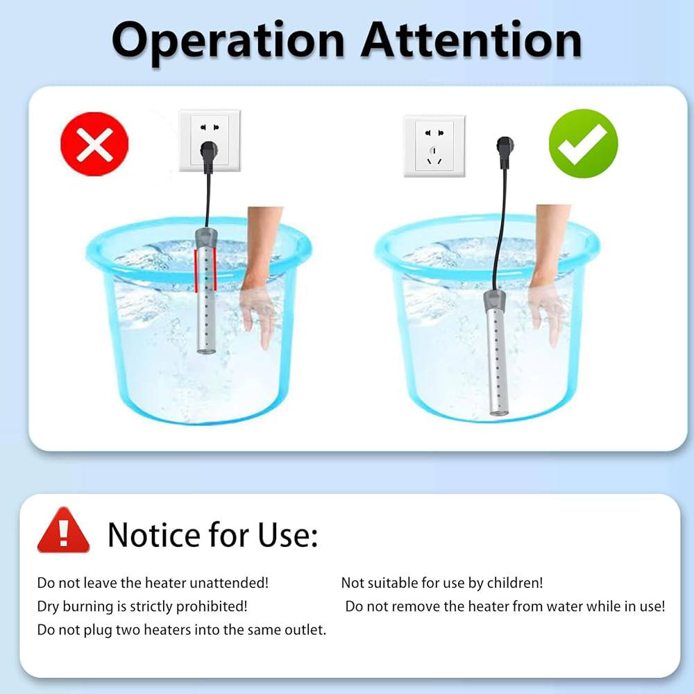 【إرشادات استخدام السلامة】اغمرها بالكامل دائمًا قبل التشغيل. لا تلمس الماء أثناء التسخين. تجنب الاستخدام المستمر لأكثر من 2-3 ساعات. لا تقم بتوصيل سخانات متعددة في منفذ واحد. افصل الطاقة قبل الإزالة. اتبع التعليمات للتشغيل الآمن لسخان المياه الغاطس الخاص بك.