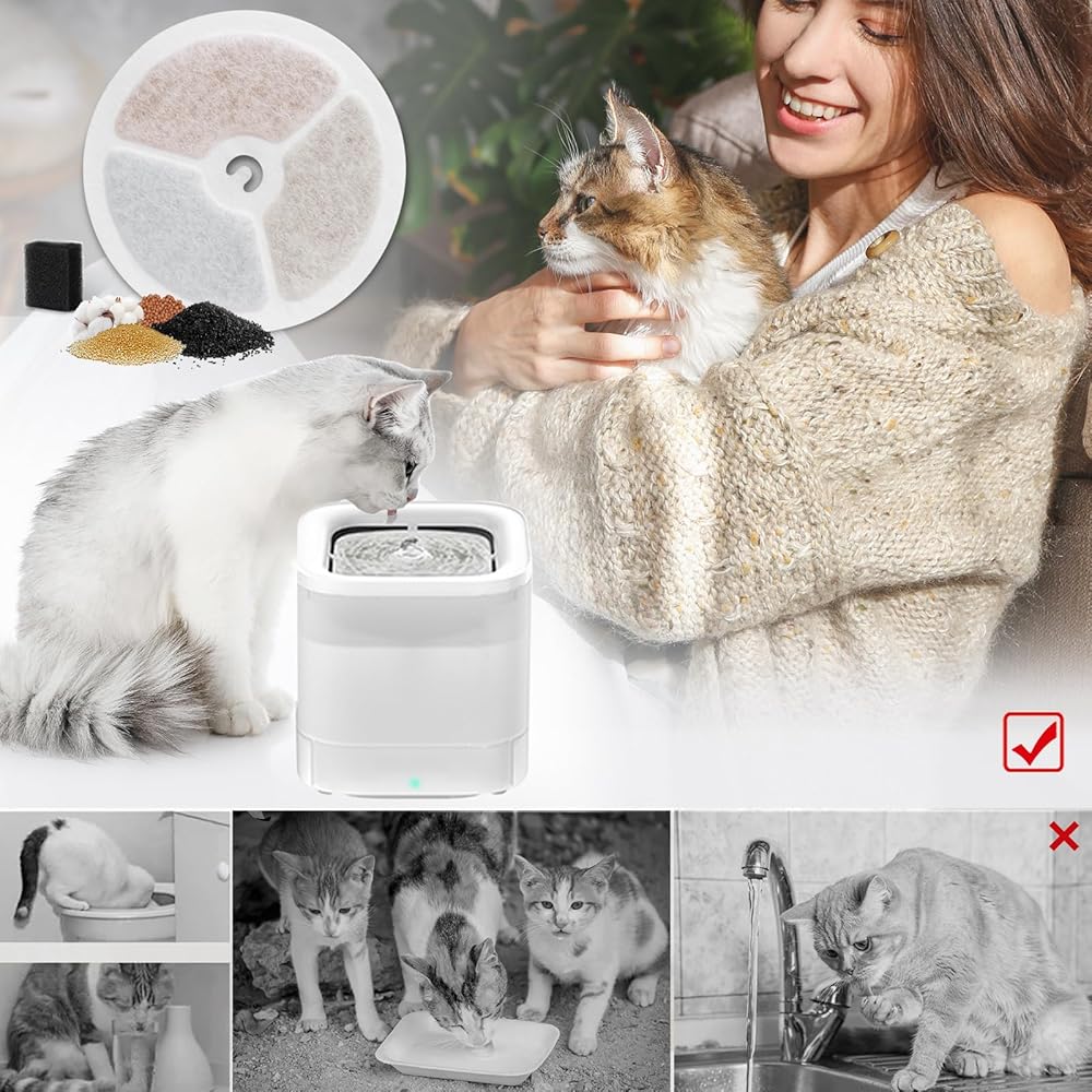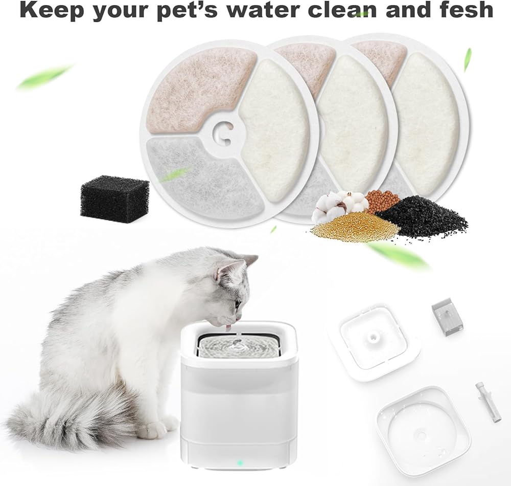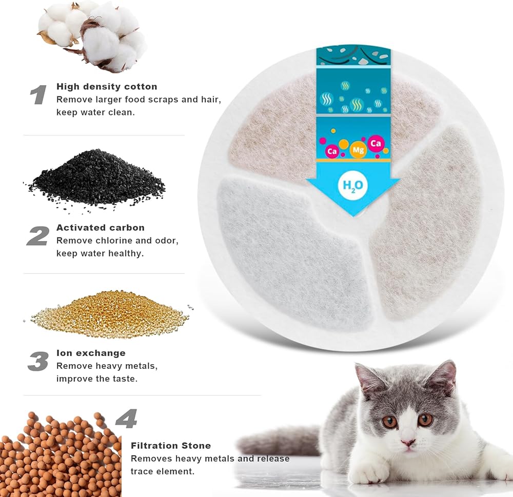 ترشيح ثلاثي الطبقات لمياه أكثر نظافة وأكثر أمانًا، تم تصميم كل فلتر بطبقة قطنية كثيفة، والكربون المنشط الممتاز، وراتنج التبادل الأيوني لإزالة الشعر والحطام والروائح والكلور والمعادن الثقيلة بشكل فعال - مما يوفر مياه أكثر نضارة وأفضل مذاقًا لقطتك.