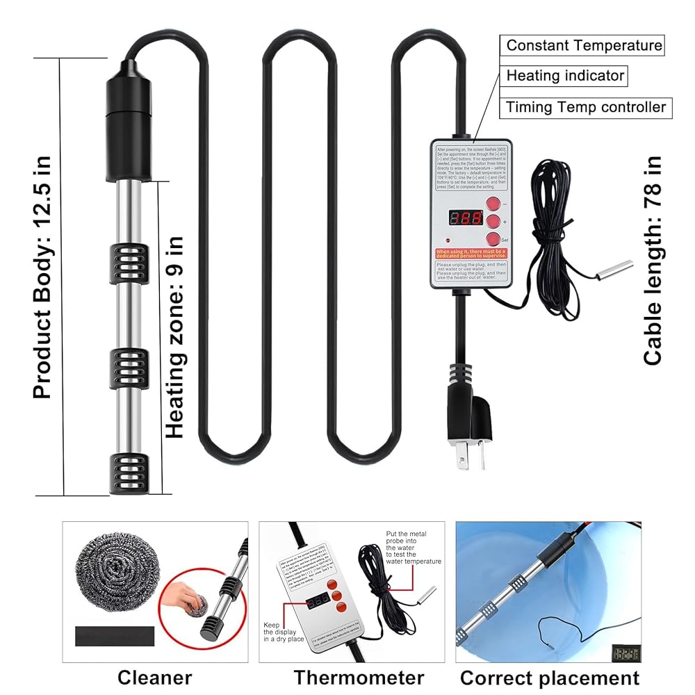• ⏰ 【المؤقت الذكي ووضع الضبط المسبق - قم بالتسخين وفقًا لجدولك الزمني】 على عكس الطرازات الأساسية، يتميز سخان المياه الغاطس هذا بمؤقت قابل للبرمجة. اضبط تأخيرًا يصل إلى 999 دقيقة لبدء التسخين تلقائيًا - وهو مثالي للاستيقاظ لمياه الحمام الدافئة أو العودة إلى حمام السباحة المُدفأ مسبقًا. التحكم الرقمي الكامل يضع الراحة في متناول يدك.
