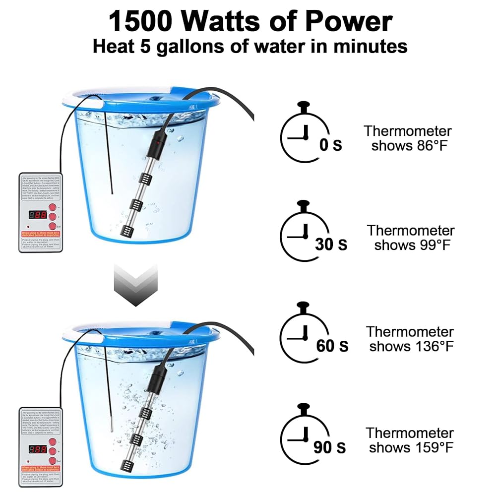 سخان مياه غاطس 1500 واط مع مؤقت رقمي وثرموستات، سخان غاطس محمول 304SS للدلو، حوض الاستحمام، حمام السباحة، التخييم، الإغلاق التلقائي، شاشة LCD، حماية من الحرارة الزائدة