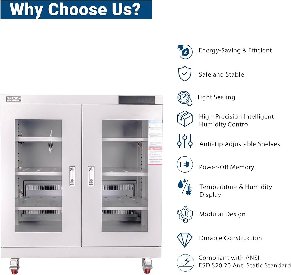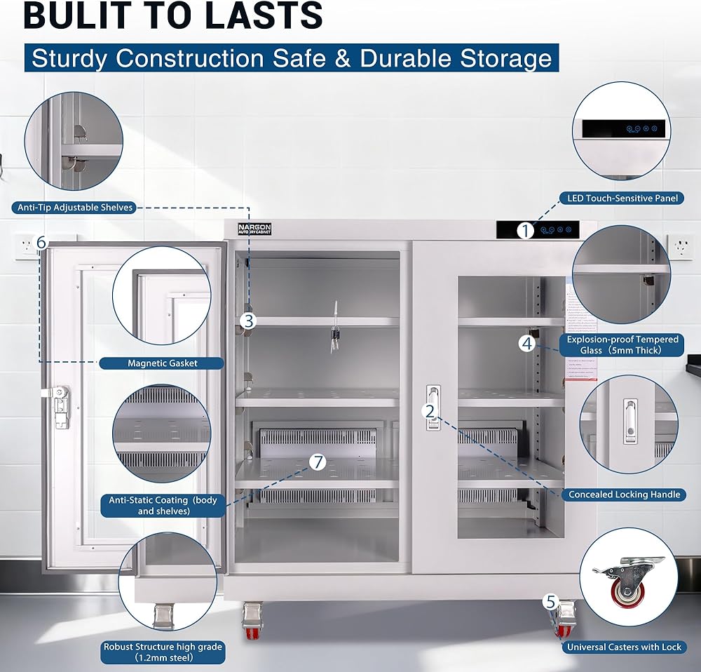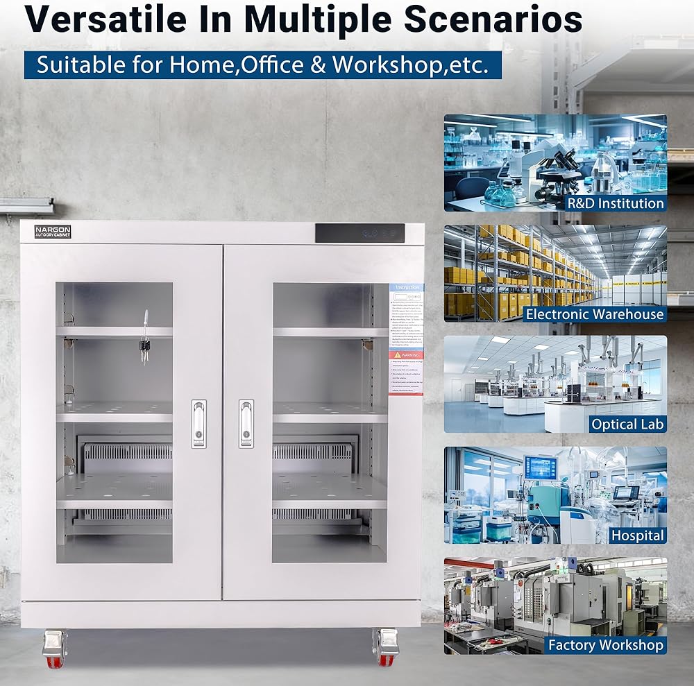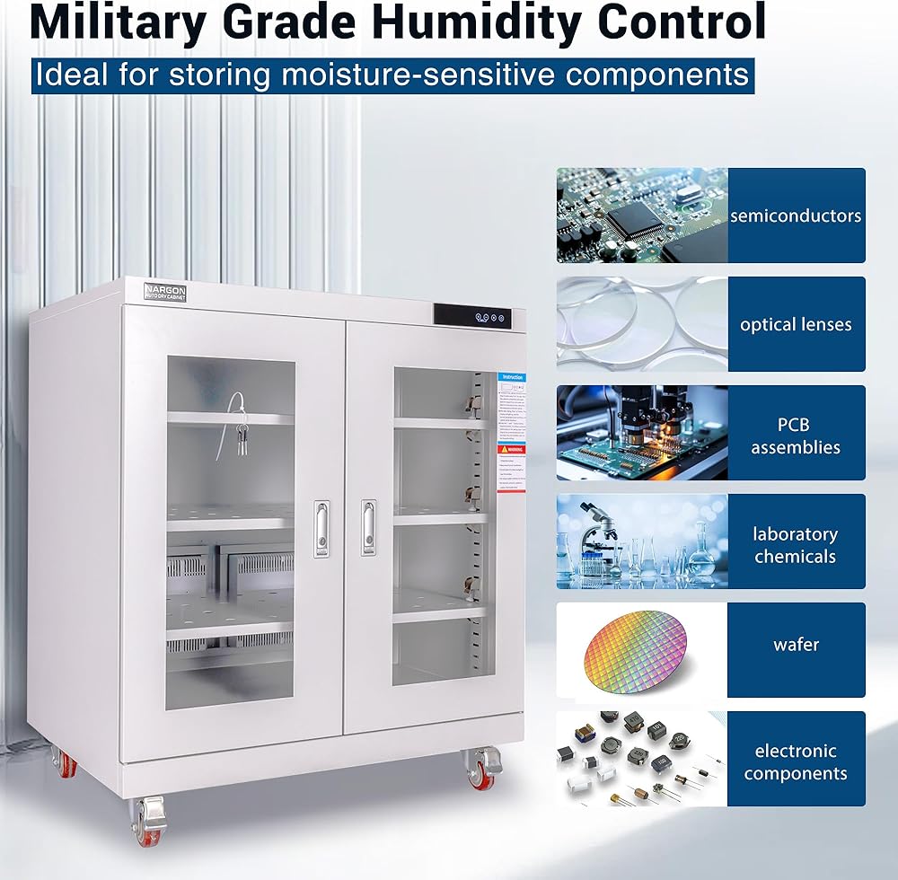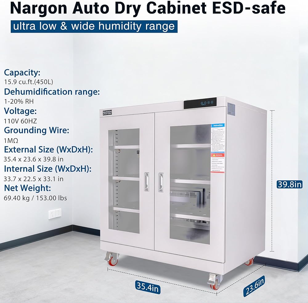 خزانة NARGON 1-20% RH 450L الإلكترونية الجافة، خزانة تجفيف ESD لتخزين العدسات البصرية، مجموعات РСВ، الرقاقة، المكونات الإلكترونية، أشباه الموصلات، المواد الكيميائية المخبرية، الموديل NMC452C
