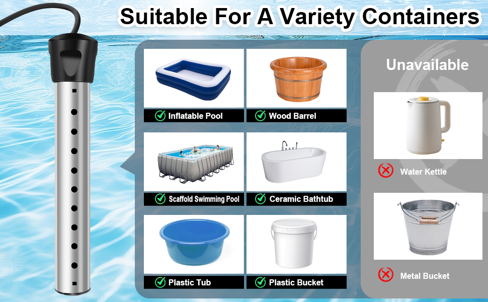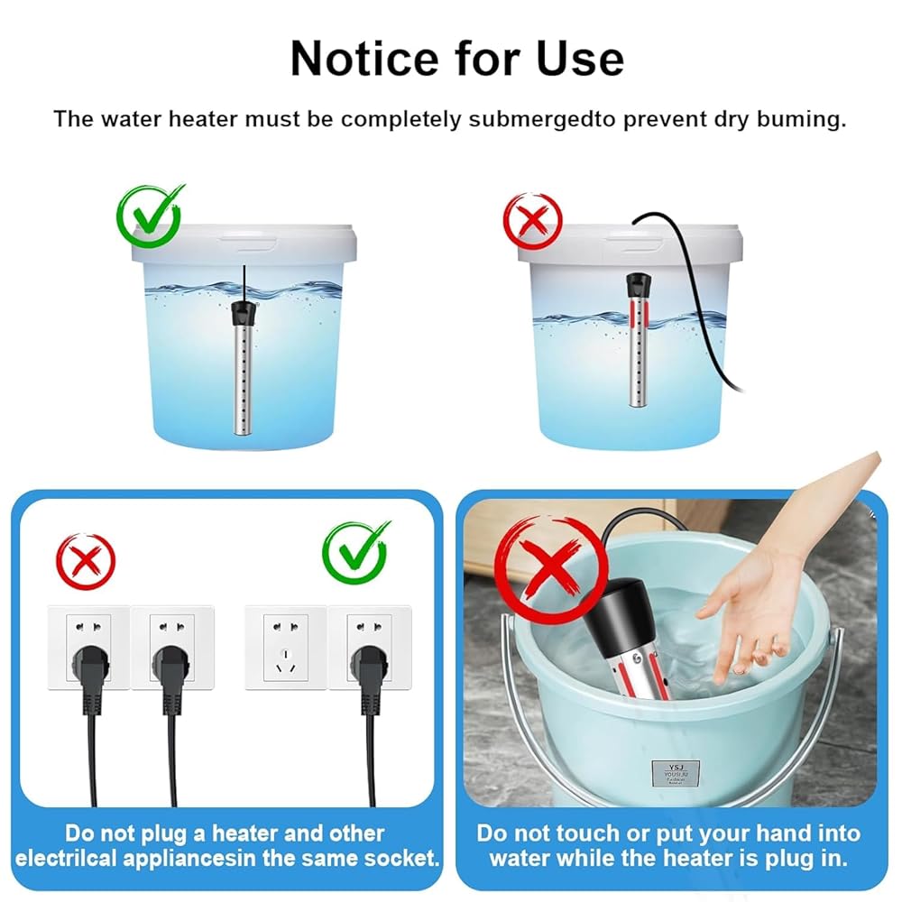 【سهل الاستخدام وأمان مهم】 ببساطة اغمره، وقم بتوصيله بمنفذ قياسي 110 فولت، واستمتع. للتشغيل الآمن: تأكد دائمًا من أن سخان الماء تحت الماء بالكامل قبل توصيله. لا تلمسه أثناء التسخين. من المستحسن ألا يتجاوز وقت الاستخدام ساعتين. لأية أسئلة، فلا تتردد في الاتصال بنا. نحن نقدم خدمة ما بعد البيع المهنية 24 ساعة في اليوم.