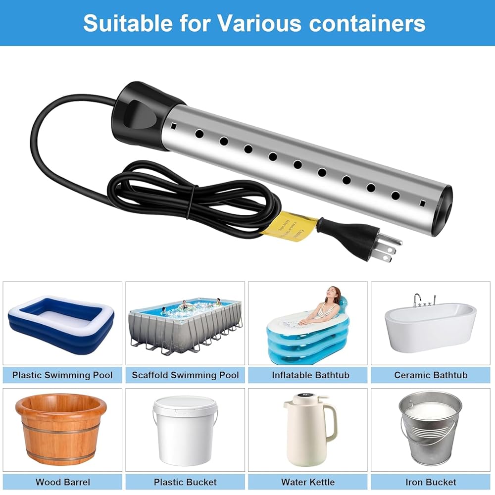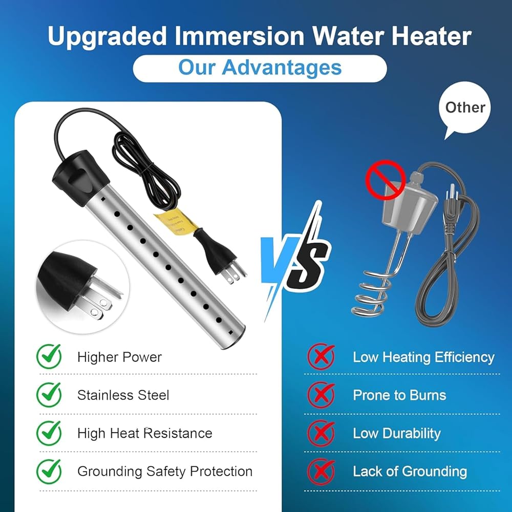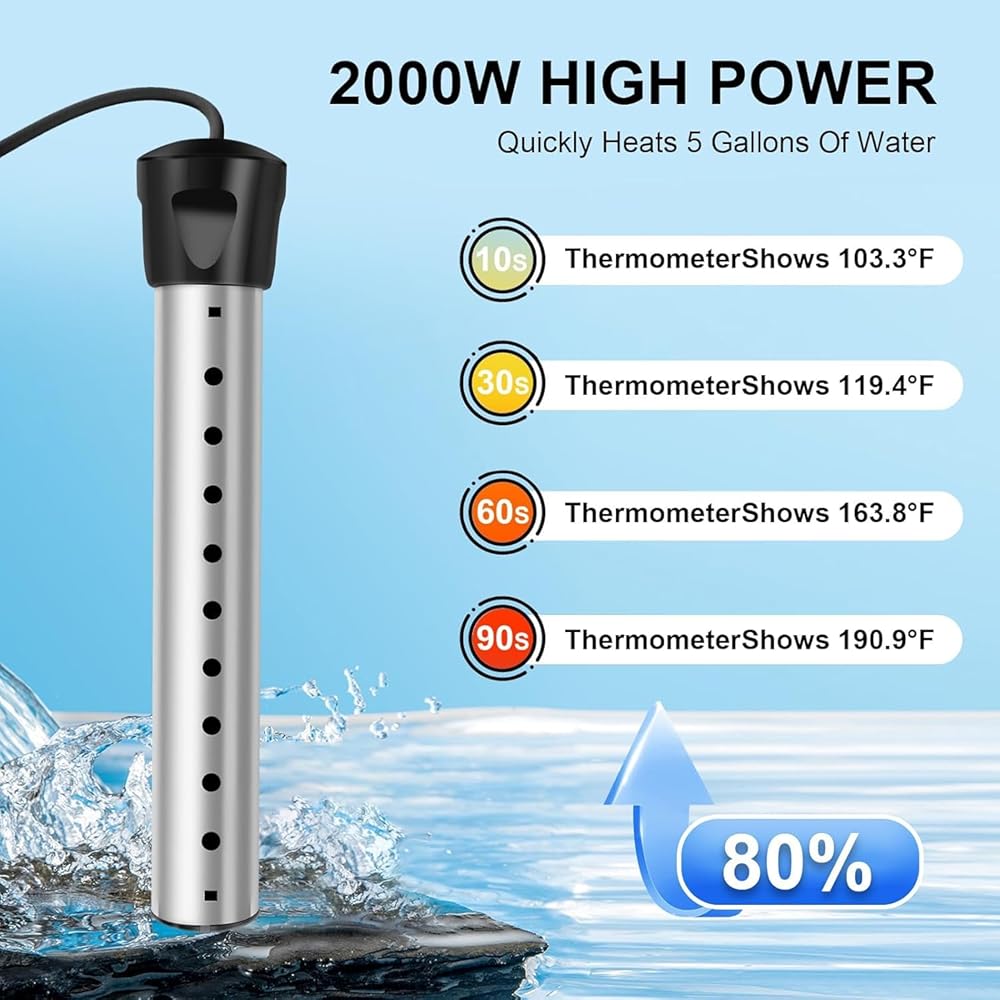 【تسخين سريع قوي بقدرة 2000 واط】 استمتع بسرعة ملحوظة مع السخان الغاطس بقدرة 2000 واط. يمكنه تسخين دلو قياسي من الماء سعة 5 جالون إلى درجة حرارة مثالية ومريحة في دقائق معدودة - وليس ساعات. مثالي للاستحمام الدافئ السريع أثناء التخييم، أو نقع القدم المهدئ بعد يوم طويل، أو أي موقف تحتاج فيه إلى الماء الساخن بسرعة.