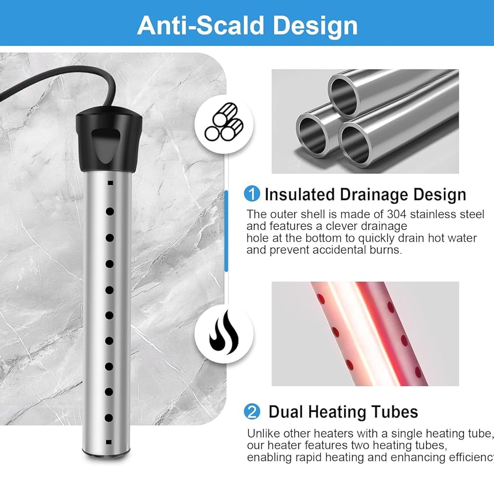 【فولاذ مقاوم للصدأ 304 آمن للغاية】سخان المياه الغاطس الخاص بنا مصنوع من الفولاذ المقاوم للصدأ 304 المقاوم للصدأ، وهو مقاوم للصدأ ومتين بشكل فعال. يضمن سخان المياه هذا التشغيل الآمن من خلال منع الاتصال المباشر بعناصر التسخين، مما يمنحك راحة البال الكاملة مع كل استخدام.