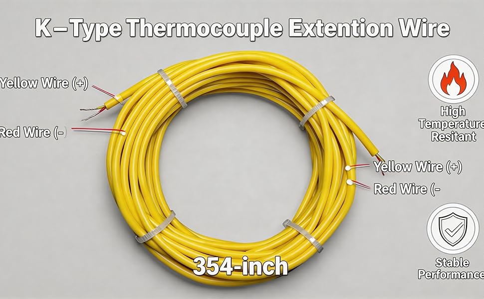 سلك مزدوج حراري من النوع K يشير السلك الأصفر إلى الطرف الموجب (+)، والسلك الأحمر يشير إلى الطرف السالب (-). تضمن العلامات الواضحة الاتصال السريع والدقيق بمختلف أدوات قياس درجة الحرارة من النوع K، مما يمنع أخطاء الأسلاك