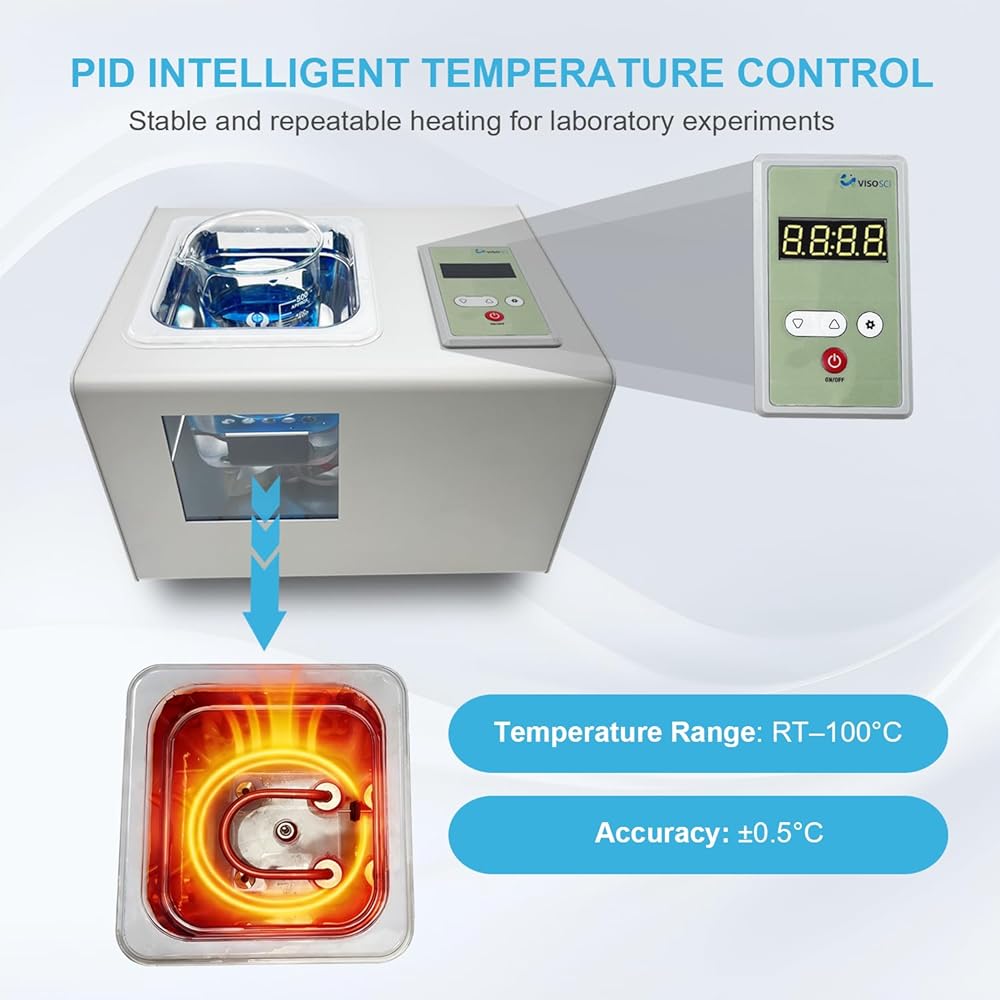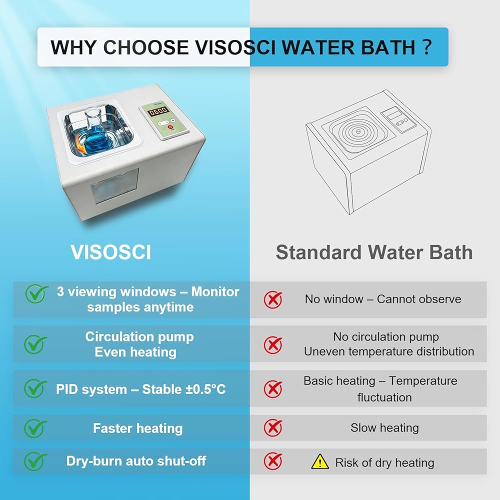 VISOSCI 2L Digital Lab Water Bath with Circulating Pump, Three-Sided Viewing Windows, PID Temperature Control up to 100°C, Fast Heating Thermostatic Laboratory Water Bath with Timer & Continuous Mode, Liquid Level Sensor & Dry-Burn Protection, 320W