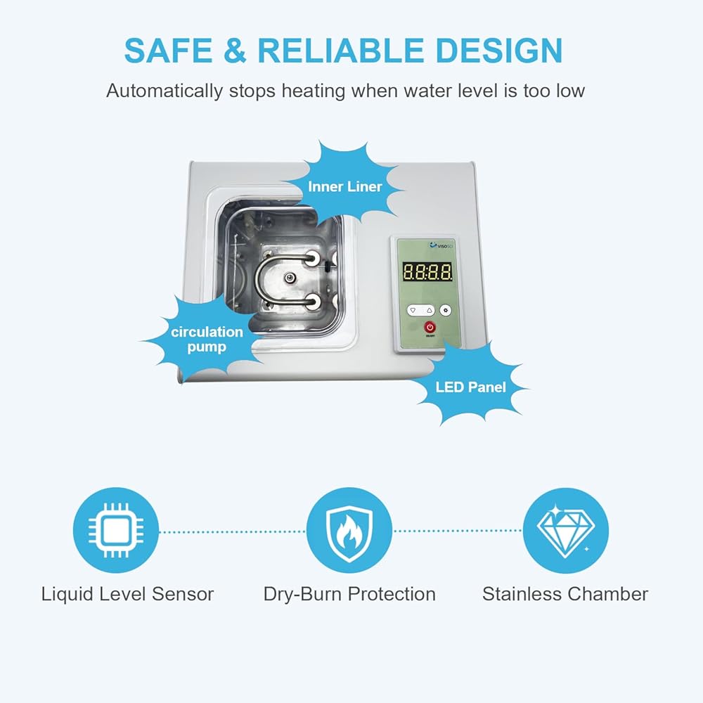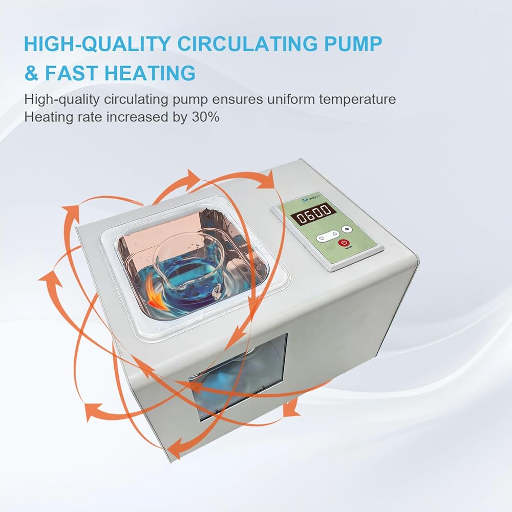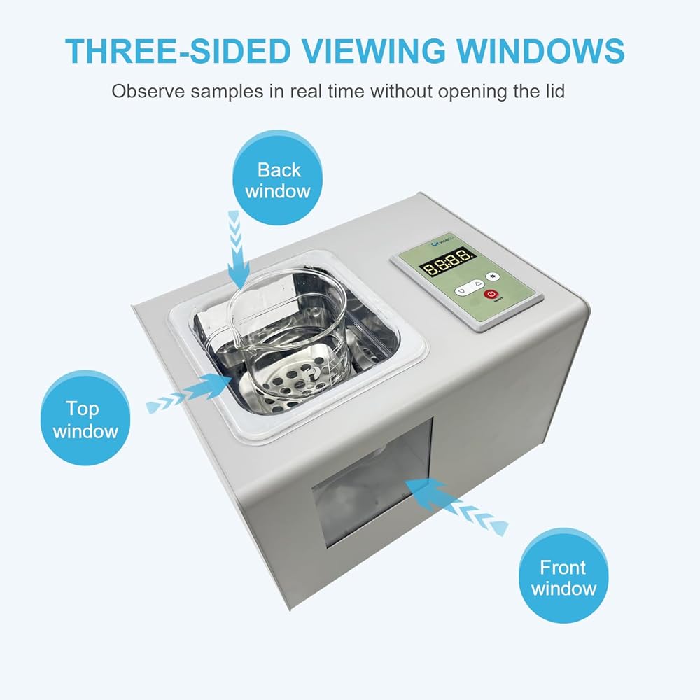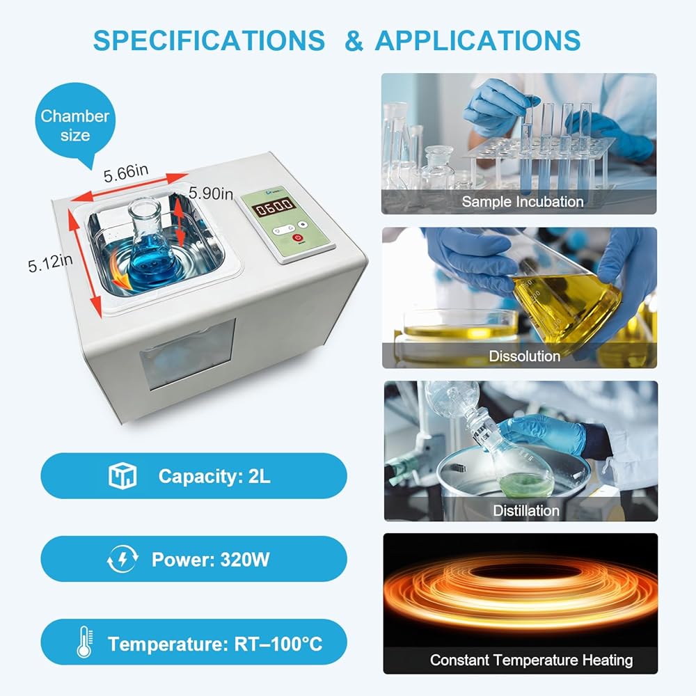 Compact Design & Wide Applications:Inner chamber size: 5.6 × 5.1 × 6 in, capacity 2L, power 320W,timer 1min to 24 hours or continuous working mode. Ideal for sample incubation, dissolution, distillation, and constant-temperature heating in laboratories, universities, research institutions, and industrial testing environments