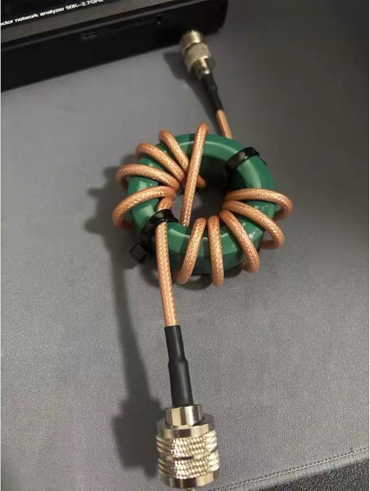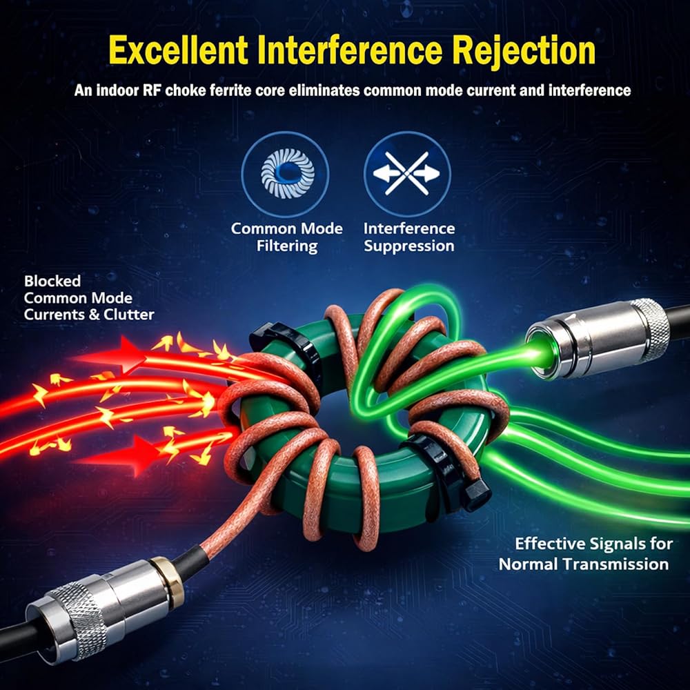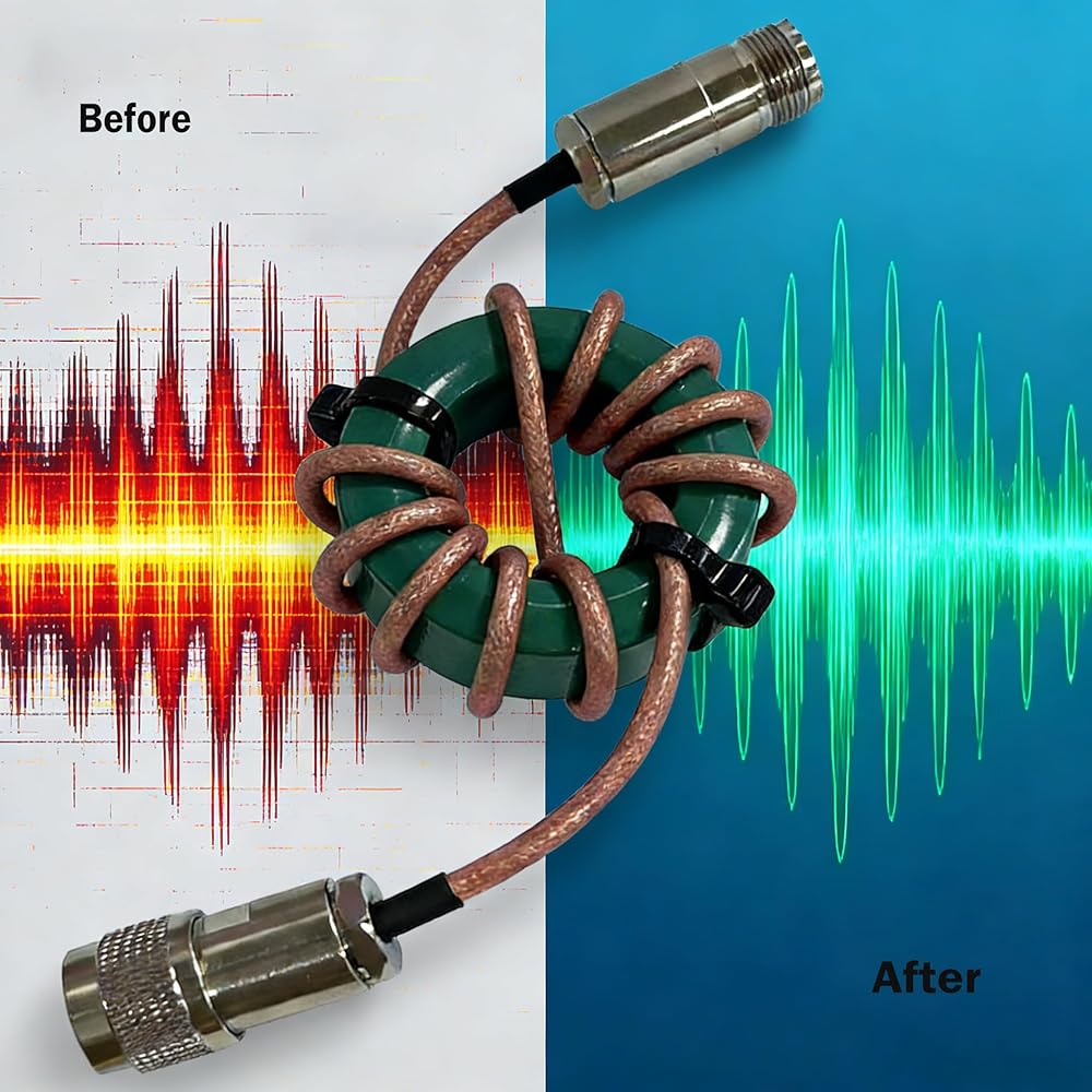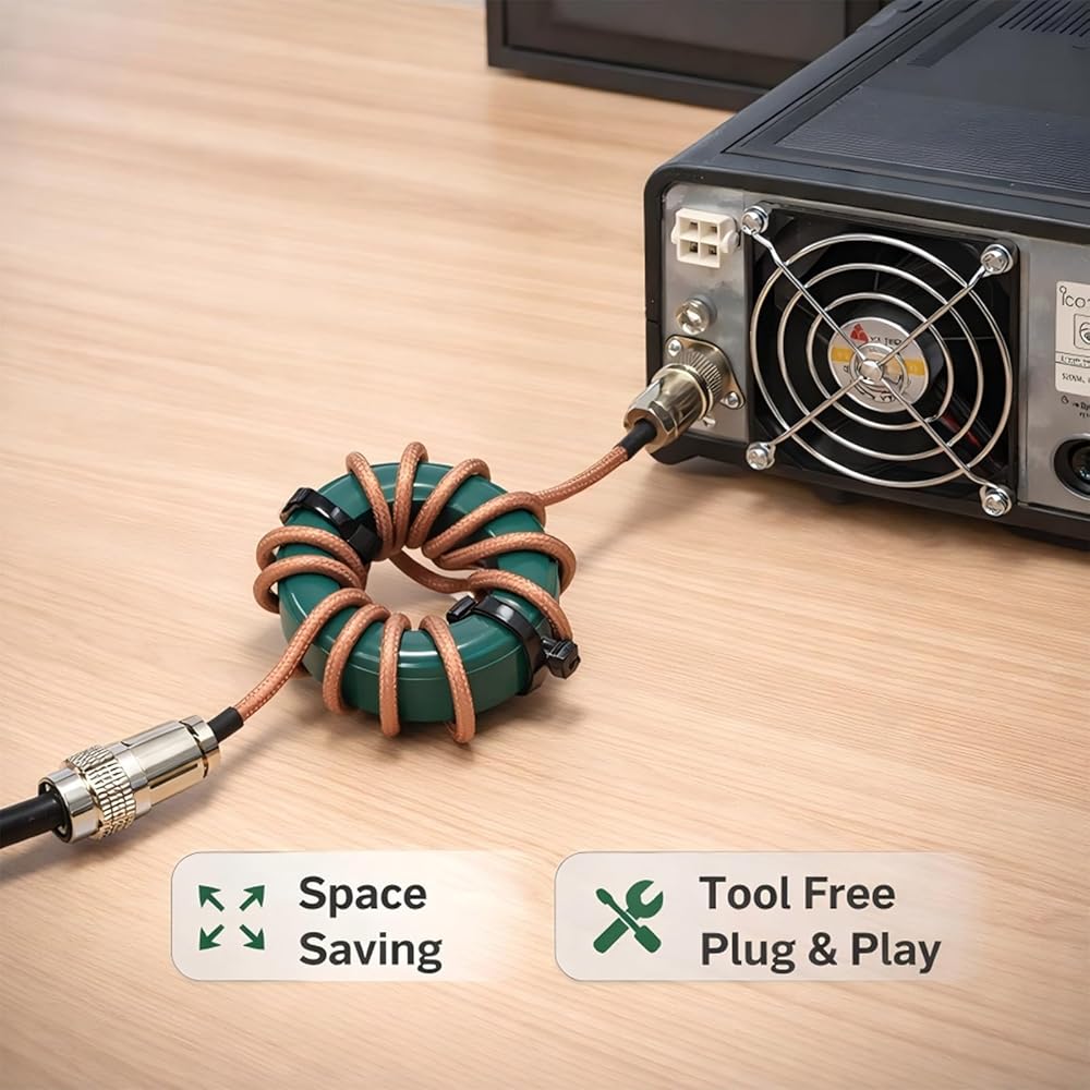 Ultra-Compact Ferrite Core: Features a lightweight, space-saving ferrite design that can be directly wrapped on 50Ω coaxial cables without the need for extra housing. This RF choke filter fits seamlessly into compact indoor radio setups and crowded desktop equipment areas