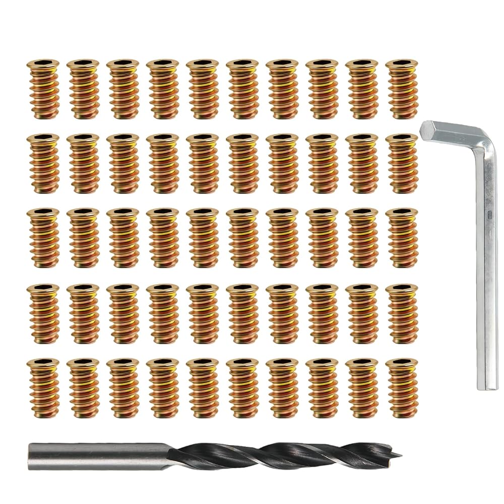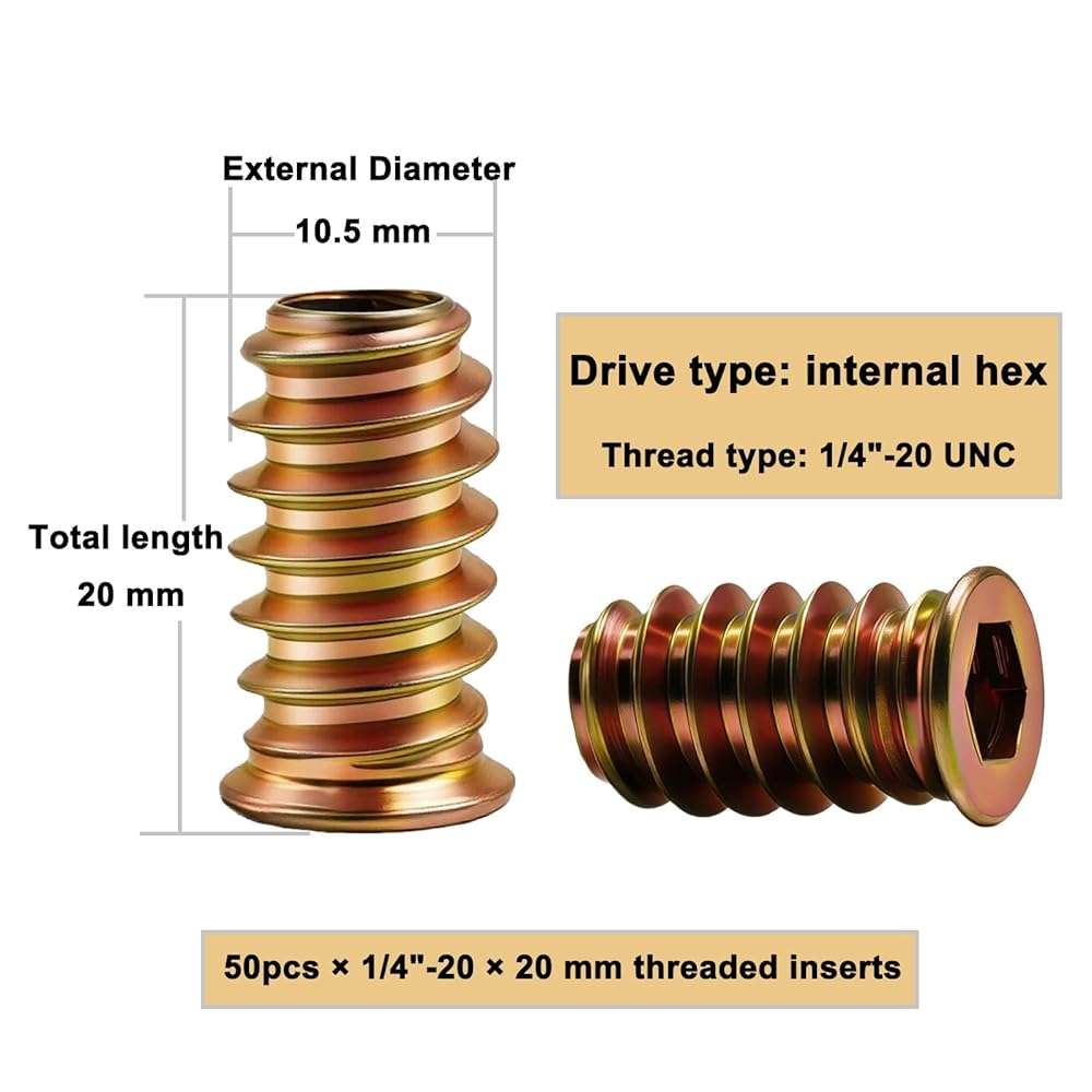 SGTBQLL 50 PCS 1/4"-20 x 20mm Threaded Inserts for Wood are designed to create strong, reusable threads in wood for furniture assembly, repair, and woodworking projects. Each insert is made of zinc-plated carbon steel for hardness, wear resistance, and corrosion protection, offering stable joints even after repeated tightening.